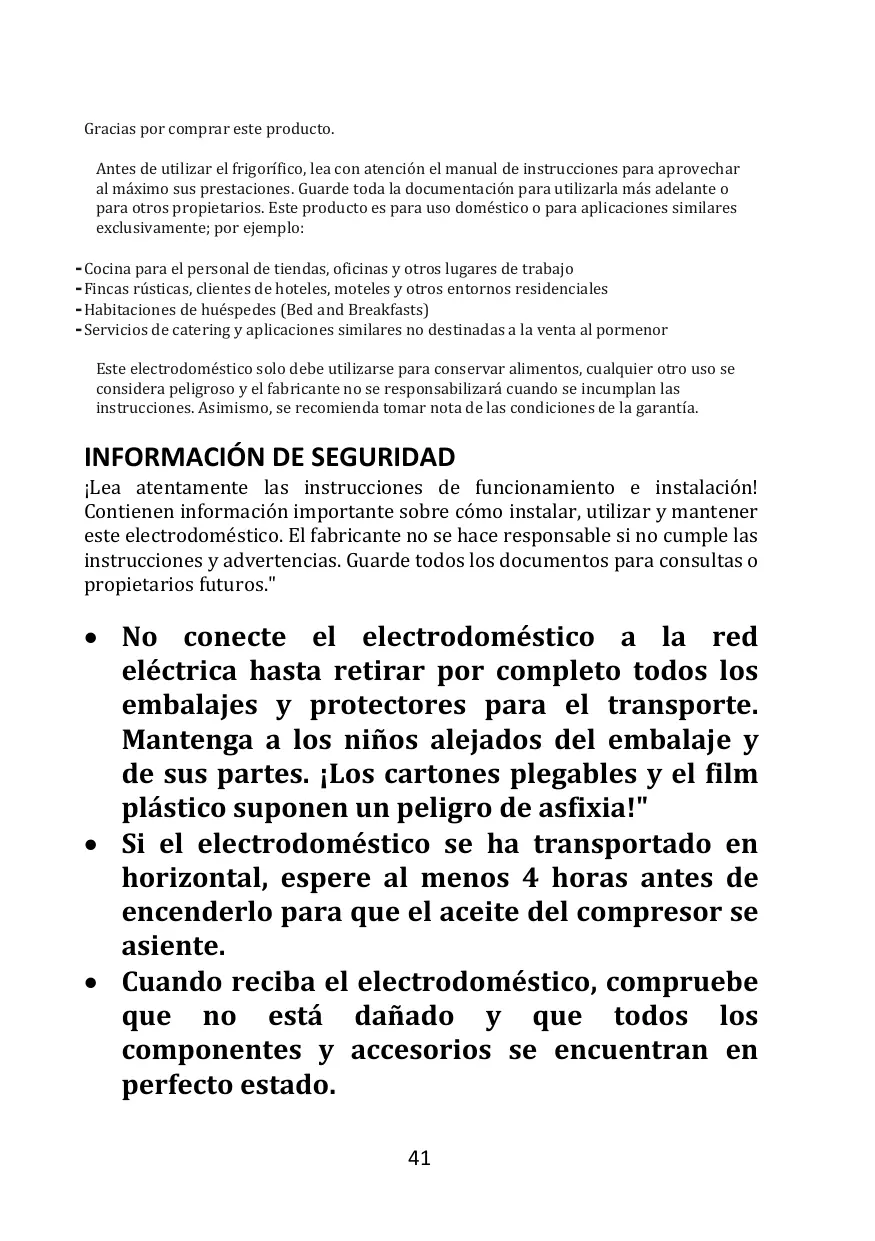 Cet appareil doit être utilisé uniquement pour conserver de la nourriture ; tout autre usage est considéré comme dangereux et le fabricant ne sera pas tenu responsable en cas de mauvaise utilisation. Il est donc recommandé de prendre connaissance des conditions de garantie.