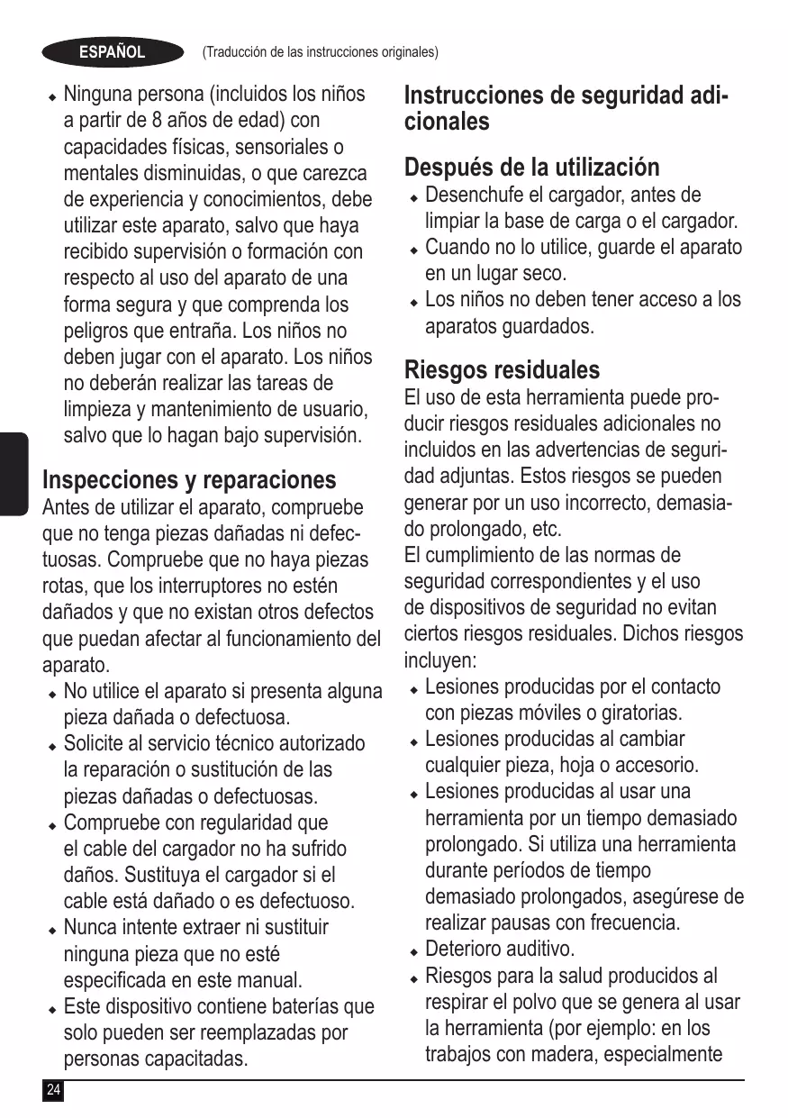 Les blessures dues au contact avec des pièces mobiles/en rotation. Les blessures dues au changement de pièces, de lames ou d’accessoires. Les blessures dues à l’utilisation prolongée d’un outil. Lorsque vous utilisez un outil quel qu’il soit pendant de longues périodes, assurez-vous de faire des pauses régulières. Troubles auditifs. Risques pour la santé dus à l’inhalation de poussières produites pendant l’utilisation de l’outil