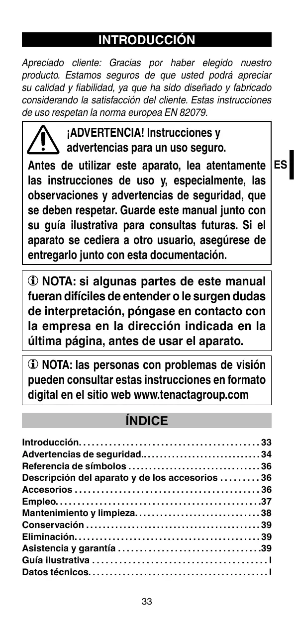 NOTA: las personas con problemas de visión pueden consultar estas instrucciones en formato digital en el sitio web www.tenactagroup.com ÍNDICE Introducción. . . . . . . . . . . . . . . . . . . . . . . . . . . . . . . . . . . . . . . . . . 33 Advertencias de seguridad.. . . . . . . . . . . . . . . . . . . . . . . . . . . . . 34 Referencia de símbolos . . . . . . . . . . . . . . . . . . . . . . . . . . . . . . . . 36 Descripción del aparato y de los accesorios . . . . . . . . . 36 Accesorios . . . . . . . . . . . . . . . . . . . . . . . . . . . . . . . . . . . . . . . . . . 36 Empleo. . . . . . . . . . . . . . . . . . . . . . . . . . . . . . . . . . . . . . . . . . . . . . .37 Mantenimiento y limpieza. . . . . . . . . . . . . . . . . . . . . . . . . . . . . . 38 Conservación . . . . . . . . . . . . . . . . . . . . . . . . . . . . . . . . . . . . . . . . . . 39 Eliminación. . . . . . . . . . . . . . . . . . . . . . . . . . . . . . . . . . . . . . . . . . . . 39 Asistencia y garantía . . . . . . . . . . . . . . . . . . . . . . . . . . . . . . . . .39 Guía ilustrativa . . . . . . . . . . . . . . . . . . . . . . . . . . . . . . . . . . . . . . . I Datos técnicos. . . . . . . . . . . . . . . . . . . . . . . . . . . . . . . . . . . . . . . . . . I 33