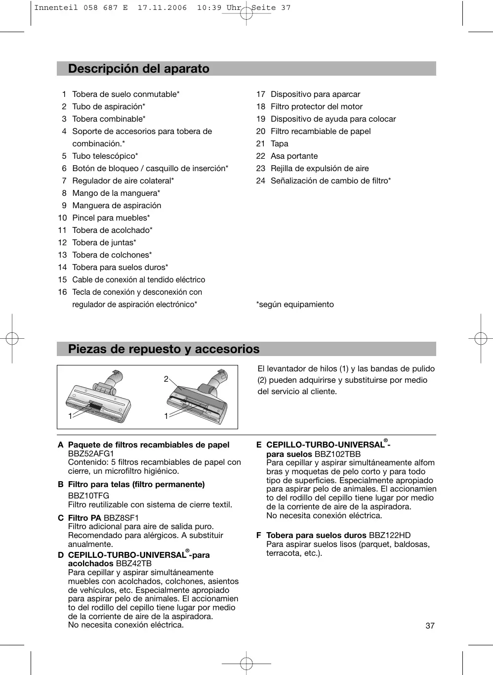 A Paquete de filtros recambiables de papel BBZ52AFG1 Contenido: 5 filtros recambiables de papel con cierre, un microfiltro higiénico. B Filtro para telas (filtro permanente) BBZ10TFG Filtro reutilizable con sistema de cierre textil. C Filtro PA BBZ8SF1 Filtro adicional para aire de salida puro. Recomendado para alérgicos. A substituir anualmente. ® D CEPILLO-TURBO-UNIVERSAL -para acolchados BBZ42TB Para cepillar y aspirar simultáneamente muebles con acolchados, colchones, asientos de vehículos, etc. Especialmente apropiado para aspirar pelo de animales. El accionamien to del rodillo del cepillo tiene lugar por medio de la corriente de aire de la aspiradora. No necesita conexión eléctrica.
