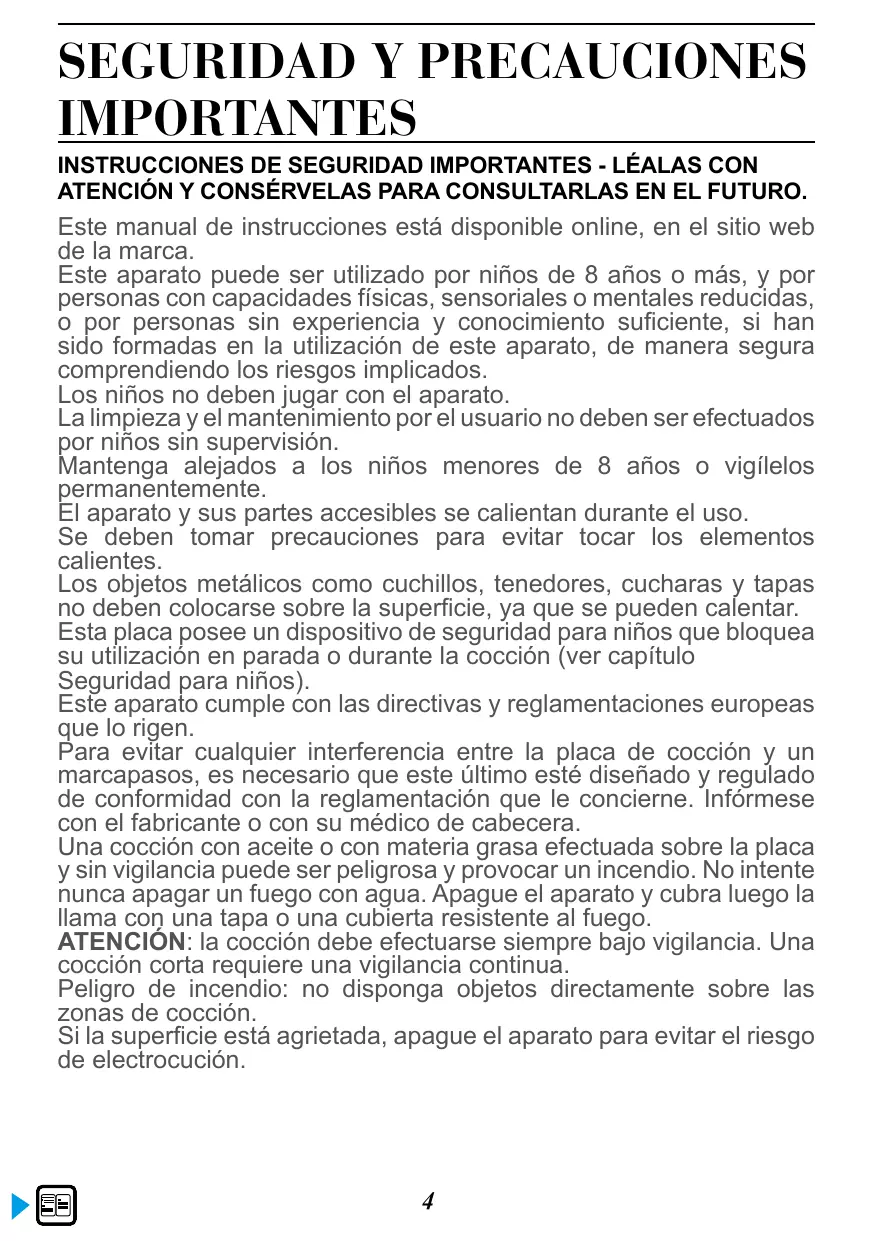 Este manual de instrucciones está disponible online, en el sitio web de la marca. Este aparato puede ser utilizado por niños de 8 años o más, y por personas con capacidades físicas, sensoriales o mentales reducidas, o por personas sin experiencia y conocimiento suficiente, si han sido formadas en la utilización de este aparato, de manera segura comprendiendo los riesgos implicados. Los niños no deben jugar con el aparato. La limpieza y el mantenimiento por el usuario no deben ser efectuados por niños sin supervisión. Mantenga alejados a los niños menores de 8 años o vigílelos permanentemente. El aparato y sus partes accesibles se calientan durante el uso. Se deben tomar precauciones para evitar tocar los elementos calientes. Los objetos metálicos como cuchillos, tenedores, cucharas y tapas no deben colocarse sobre la superficie, ya que se pueden calentar. Esta placa posee un dispositivo de seguridad para niños que bloquea su utilización en parada o durante la cocción (ver capítulo Seguridad para niños). Este aparato cumple con las directivas y reglamentaciones europeas que lo rigen. Para evitar cualquier interferencia entre la placa de cocción y un marcapasos, es necesario que este último esté diseñado y regulado de conformidad con la reglamentación que le concierne. Infórmese con el fabricante o con su médico de cabecera. Una cocción con aceite o con materia grasa efectuada sobre la placa y sin vigilancia puede ser peligrosa y provocar un incendio. No intente nunca apagar un fuego con agua. Apague el aparato y cubra luego la llama con una tapa o una cubierta resistente al fuego. ATENCIÓN: la cocción debe efectuarse siempre bajo vigilancia. Una cocción corta requiere una vigilancia continua. Peligro de incendio: no disponga objetos directamente sobre las zonas de cocción. Si la superficie está agrietada, apague el aparato para evitar el riesgo de electrocución.