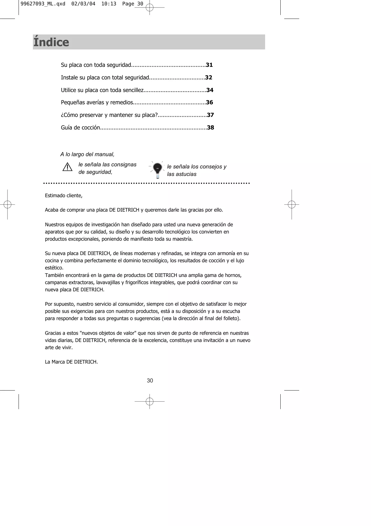 Vous venez d'acquérir une table DE DIETRICH et nous vous en remercions. Nos équipes de recherche ont conçu pour vous une nouvelle génération d'appareils, qui par leur qualité, leur design et leurs évolutions technologiques en font des produits d'exception et révèle un savoir-faire unique. Avec des lignes modernes et raffinées, votre nouvelle table DE DIETRICH s'intègre harmonieusement dans votre cuisine et allie parfaitement la maîtrise technologique, les performances de cuisson, et le luxe esthétique. Vous trouverez également dans la gamme des produits DE DIETRICH, un vaste choix de fours, de hottes aspirantes, de lave-vaisselle et de réfrigérateurs intégrables, que vous pourrez coordonner à votre nouvelle table DE DIETRICH. Bien entendu, dans un souci permanent de satisfaire au mieux vos exigences vis à vis de nos produits, notre service consommateurs est à votre disposition et à votre écoute pour répondre à toutes vos questions ou suggestions (coordonnées à la fin de ce livret). Grâce à ces "nouveaux objets de valeurs" qui nous servent de repère dans nos vies de tous les jours, DE DIETRICH, référence de l'excellence, est une véritable invitation à un nouvel art de vivre. La Marque DE DIETRICH.