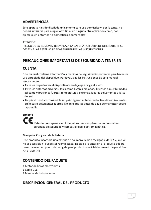 CONSIGNES DE SÉCURITÉ IMPORTANTES Cette notice d’utilisation contient d’importantes consignes de sécurité et instructions d’utilisation correcte de l’appareil. Respectez les instructions et consignes de cette notice d’utilisation. • Veillez à ce que le produit ne subisse pas de choc et ne tombe pas. • N’exposez pas l’appareil à un environnement agressif, par exemple un environnement détrempé ou mouillé, une humidité élevée, la pluie, des vibrations importantes, des températures très élevées ou très basses, des environnements très poussiéreux ou exposés à une forte luminosité solaire. • Pour nettoyer le produit, essuyez-le doucement en utilisant uniquement un chiffon légèrement humide. N’utilisez pas de détergent puissant ni de solvant chimique. Ne laissez pas des gouttes d’eau sur l’écran. Symbole Ce symbole indique que l'appareil est conforme aux normes européennes de sécurité et de compatibilité électromagnétique. Manipulation et utilisation des piles Ce produit est fourni avec une batterie rechargeable lithium polymère 3,7 V. Elle est intégrée dans le produit, n'est pas accessible et ne peut pas être remplacée. C'est pourquoi le produit usagé doit être déposé dans un centre de recyclage.