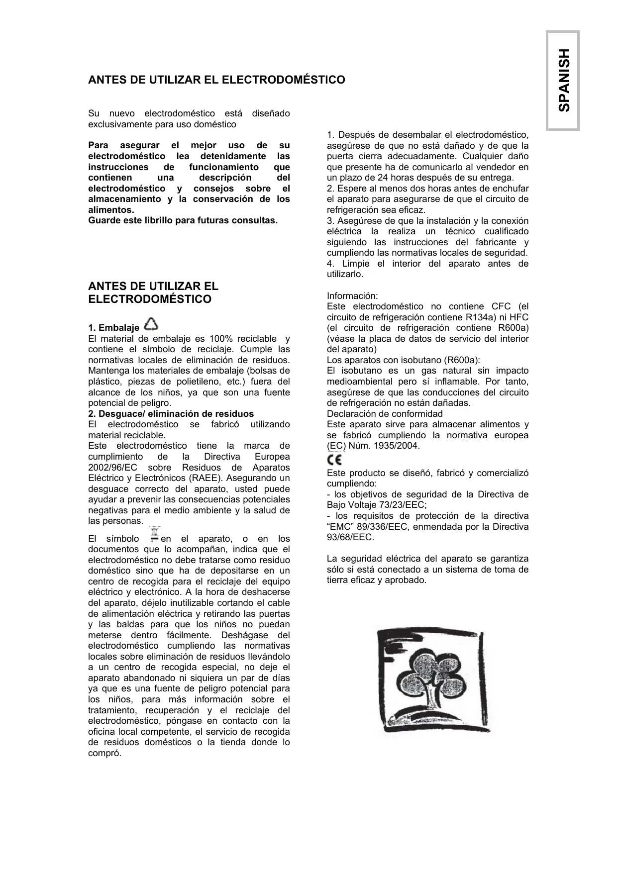 2. Espere al menos dos horas antes de enchufar el aparato para asegurarse de que el circuito de refrigeración sea eficaz. 3. Asegúrese de que la instalación y la conexión eléctrica la realiza un técnico cualificado siguiendo las instrucciones del fabricante y cumpliendo las normativas locales de seguridad. 4. Limpie el interior del aparato antes de utilizarlo. Información: Este electrodoméstico no contiene CFC (el circuito de refrigeración contiene R134a) ni HFC (el circuito de refrigeración contiene R600a) (véase la placa de datos de servicio del interior del aparato) Los aparatos con isobutano (R600a): El isobutano es un gas natural sin impacto medioambiental pero sí inflamable. Por tanto, asegúrese de que las conducciones del circuito de refrigeración no están dañadas. Declaración de conformidad Este aparato sirve para almacenar alimentos y se fabricó cumpliendo la normativa europea (EC) Núm. 1935/2004. Este producto se diseñó, fabricó y comercializó cumpliendo: - los objetivos de seguridad de la Directiva de Bajo Voltaje 73/23/EEC; - los requisitos de protección de la directiva “EMC” 89/336/EEC, enmendada por la Directiva 93/68/EEC. La seguridad eléctrica del aparato se garantiza sólo si está conectado a un sistema de toma de tierra eficaz y aprobado.