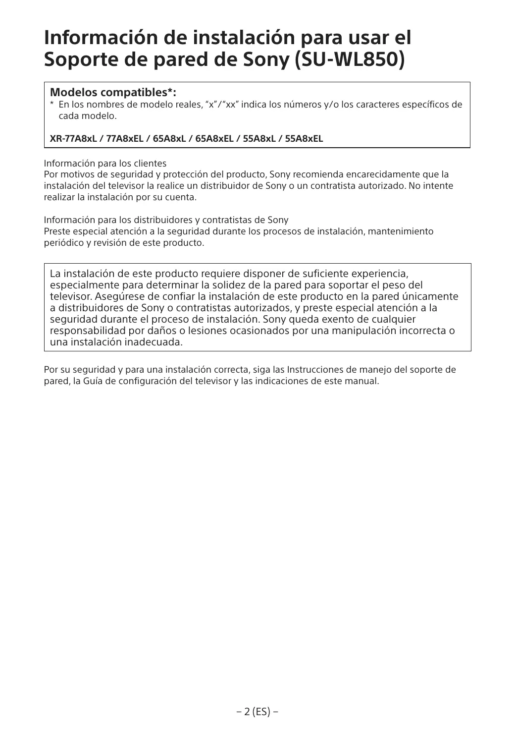 Las instrucciones siguientes están destinadas únicamente a los distribuidores de Sony. Asegúrese de leer las precauciones de seguridad descritas anteriormente y preste especial atención a la seguridad durante la instalación, el mantenimiento y la comprobación de este producto.
