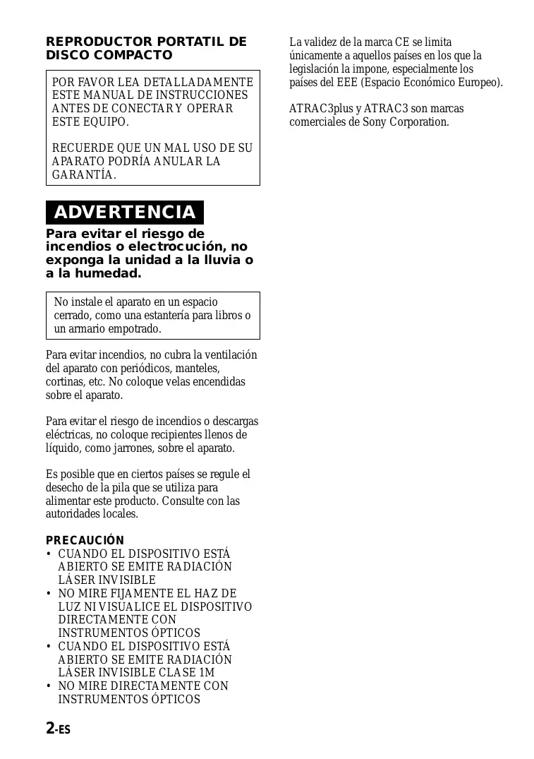 No instale el aparato en un espacio cerrado, como una estantería para libros o un armario empotrado. Para evitar incendios, no cubra la ventilación del aparato con periódicos, manteles, cortinas, etc. No coloque velas encendidas sobre el aparato. Para evitar el riesgo de incendios o descargas eléctricas, no coloque recipientes llenos de líquido, como jarrones, sobre el aparato. Es posible que en ciertos países se regule el desecho de la pila que se utiliza para alimentar este producto. Consulte con las autoridades locales. PRECAUCIÓN 1. Inserte un CD. 13 2. Conecte el reproductor de CD. 13 3. Reproduzca un CD. 13