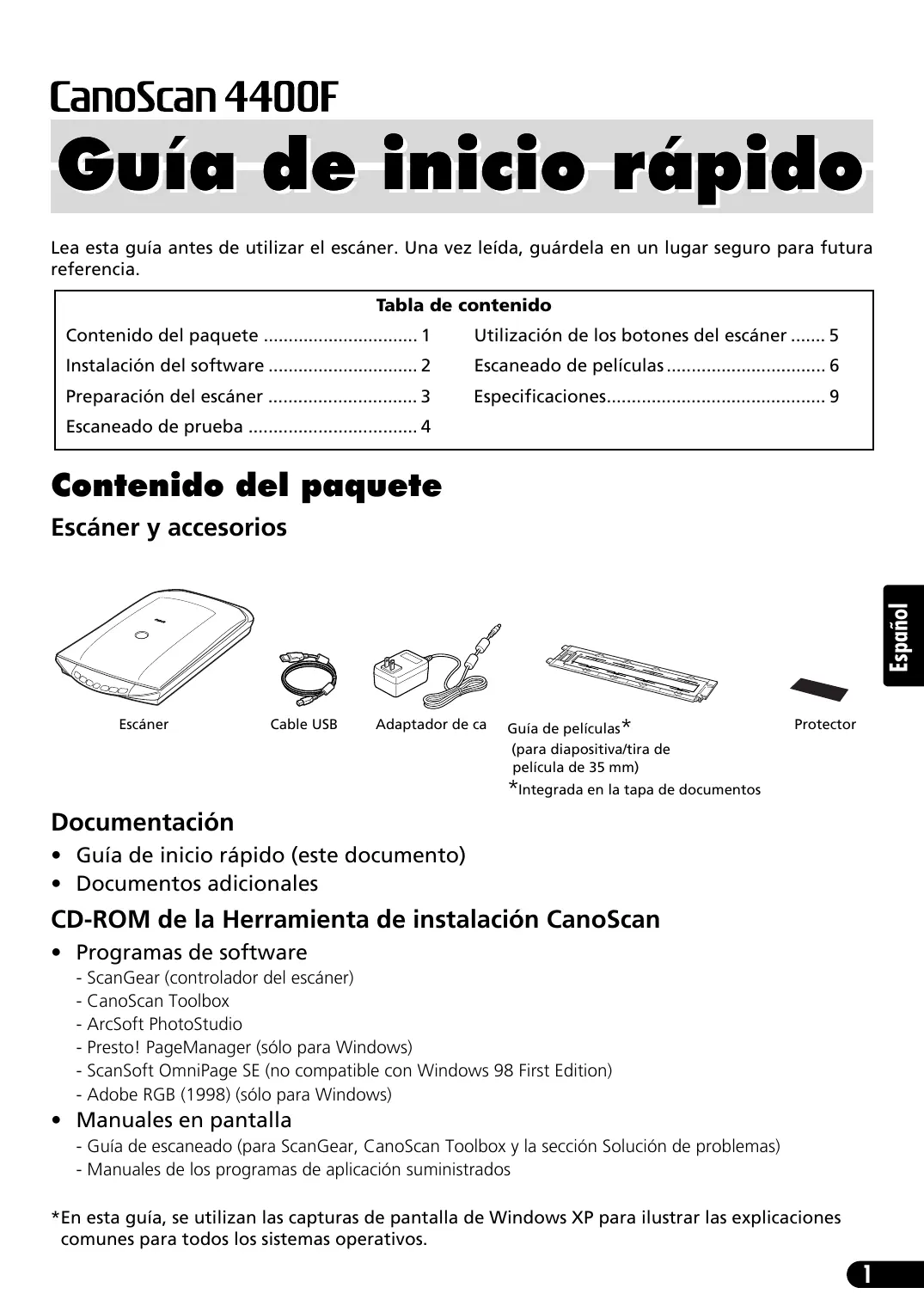 - Escaneado de prueba Contenido del paquete Español Escáner y accesorios Escáner Cable USB Adaptador de ca Guía de películas* (para diapositiva/tira de película de 35 mm) Protector *Integrada en la tapa de documentos Documentación p. 4