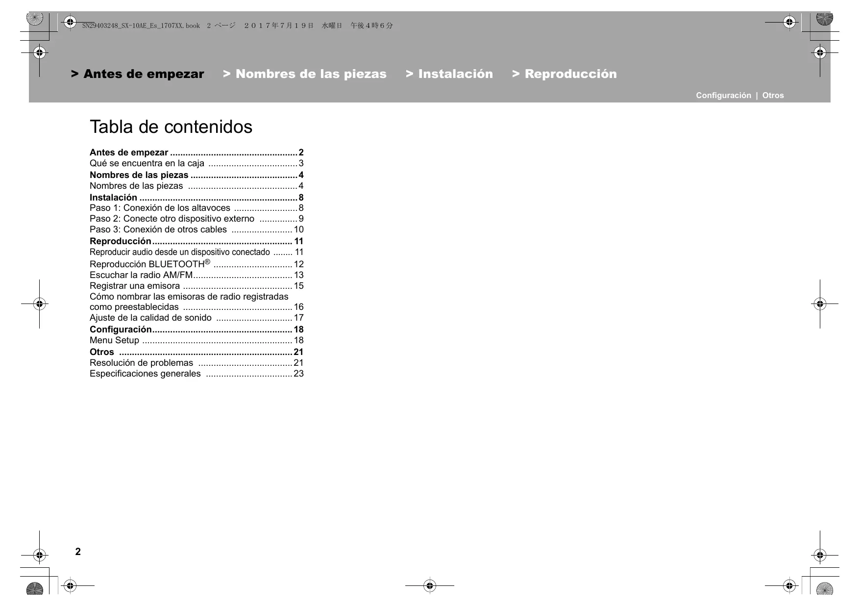 Antes de empezar 2 Qué se encuentra en la caja 3 Nombres de las piezas 4 Nombres de las piezas 4 Instalación 8 Paso 1: Conexión de los altavoces 8 Paso 2: Conecte otro dispositivo externo 9 Paso 3: Conexión de otros cables 10 Reproducción 11 Reproducir audio desde un dispositivo conectado 11 Reproducción BLUETOOTH® 12 Escuchar la radio AM/FM 13 Registrar una emisora 15 Cómo nombrar las emisoras de radio registradas como preestablecidas 16 Ajuste de la calidad de sonido 17 Configuración 18 Menu Setup 18 Otros 21 Resolución de problemas 21 Especificaciones generales 23