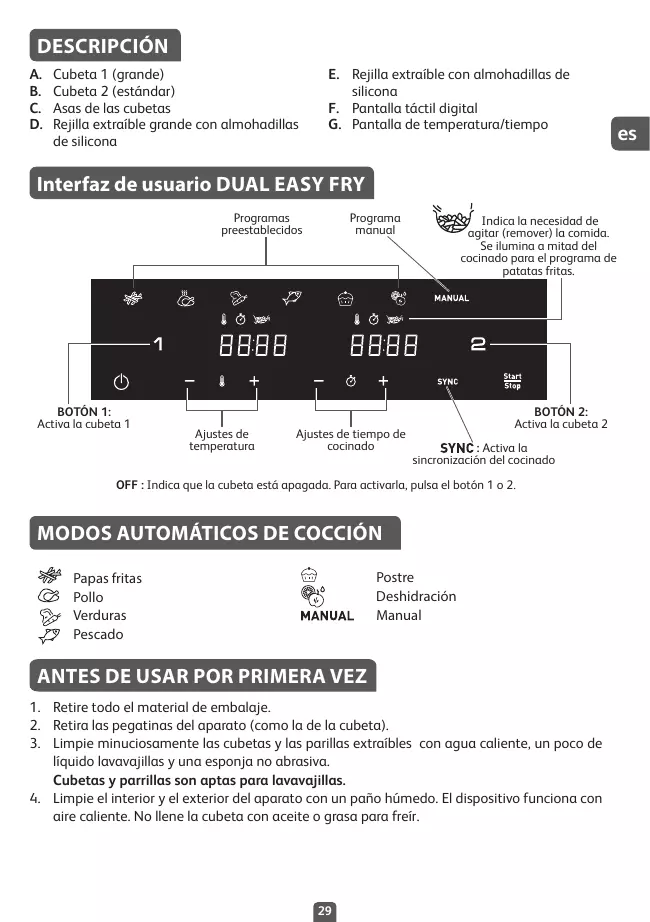 Activa la cubeta 2 : Activa la sincronización del cocinado USO DE AMBAS CUBETAS EN MODO DE SINCRONIZACIÓN (COCINADO DOBLE) Cocina 2 platos diferentes al mismo tiempo gracias a las dos cubetas y al modo SYNC. para encender el aparato. El modo de fritos se muestra de forma predeterminada 1. Pulsa para la cubeta 1, mientras que para la cubeta 2 se muestra OFF en la pantalla. 2. Pulsa el modo de cocinado que quieras y ajusta el tiempo y la temperatura si son diferentes a los ajustes configurados (pulsando + y -). Estos ajustes se guardarán. 3. Coloca la primera preparación en la cubeta 1 (la de la izquierda) e introduce de nuevo la cubeta en el aparato. Nota: Si la pantalla muestra «Add» (Añadir) y no se realiza ninguna acción durante 10 minutos, el programa se detiene y la pantalla vuelve a mostrar START/STOP. Tendrás volver a seleccionar los valores para reiniciar el cocinado. 4. Para activar la cubeta 2, pulsa el botón 2. 5. Pulsa el segundo modo de cocinado deseado y ajusta el tiempo y la temperatura si son diferentes a los ajustes configurados (pulsando + y -). 6. Coloca la segunda preparación en la cubeta 2 (la de la derecha) e introduce de nuevo la cubeta en el aparato. para preparar los dos platos al mismo tiempo. Si los dos modos de cocinado 7. Pulsa seleccionados tienen un tiempo de cocinado diferente, aparecerá HOLD en la pantalla para el modo de cocinado más corto (para los alimentos que necesitan menos tiempo para cocinarse). Esto significa que el aparato retrasa el inicio del cocinado para que las dos preparaciones estén listas al mismo tiempo. para comenzar a cocinar. 8. Pulsa 9. El aparato emite un pitido cuando la comida está lista, al mismo tiempo. 10. Cuando los ingredientes están listos, vacíe la cubeta dentro de un tazón o una bandeja. Para retirar los ingredientes, use un par de pinzas para levantar los ingredientes y retirarlos de la cubeta. 30