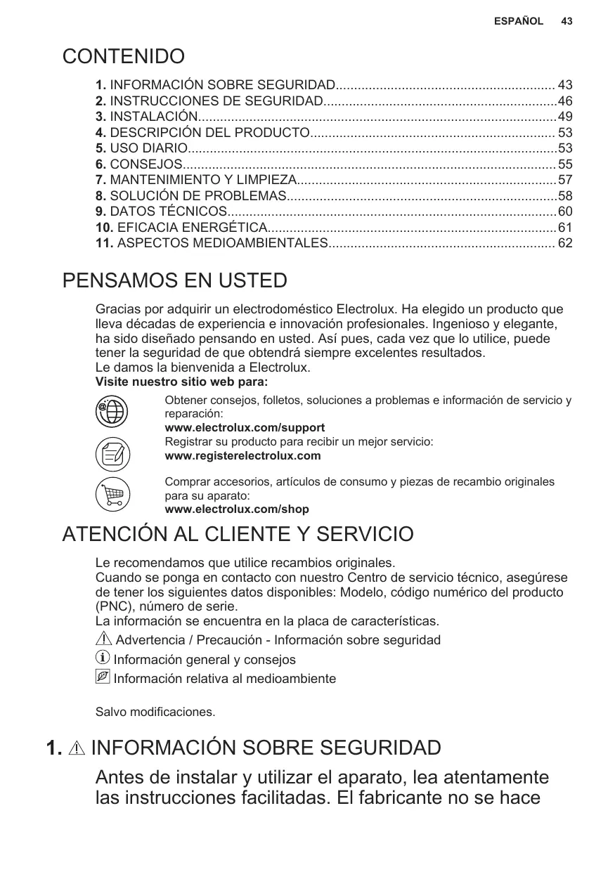 CONTENIDO 1. INFORMACIÓN SOBRE SEGURIDAD 43 2. INSTRUCCIONES DE SEGURIDAD46 3. INSTALACIÓN49 4. DESCRIPCIÓN DEL PRODUCTO 53 5. USO DIARIO53 6. CONSEJOS 55 7. MANTENIMIENTO Y LIMPIEZA57 8. SOLUCIÓN DE PROBLEMAS58 9. DATOS TÉCNICOS60 10. EFICACIA ENERGÉTICA61 11. ASPECTOS MEDIOAMBIENTALES 62