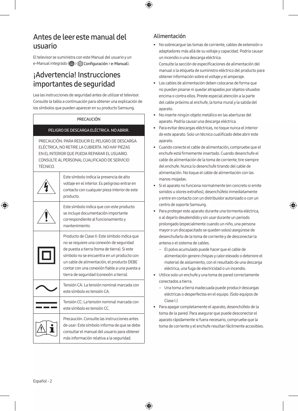 • • No sobrecargue las tomas de corriente, cables de extensión o adaptadores más allá de su voltaje y capacidad. Podría causar El televisor se suministra con este Manual del usuario y un un incendio o una descarga eléctrica. e-Manual integrado ( Consulte la sección de especificaciones de alimentación del