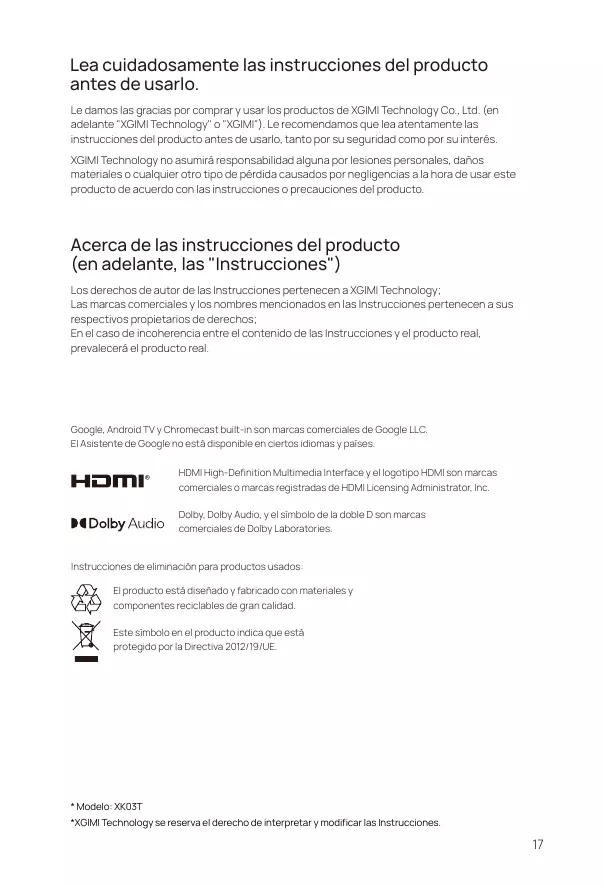 (ci-après dénommé « le mode d'emploi ») XGIMI Technology détient les droits d'auteur sur le mode d'emploi ; Les marques et noms mentionnés dans le mode d'emploi appartiennent aux titulaires de droits respectifs ; En cas de non-conformité entre le contenu du mode d'emploi et le produit réel, c'est le produit réel qui prévaut.