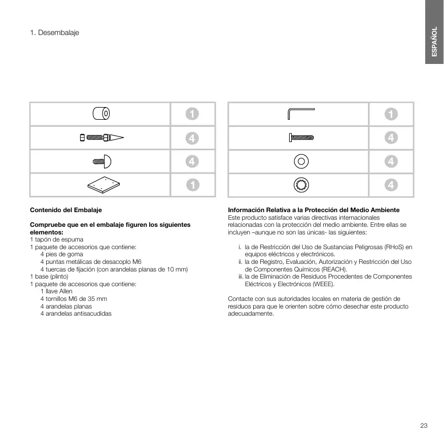 4 pieds en caoutchouc 4 pieds-pointes M6 4 écrous de blocage (10 mm) 1 support de sol 1 carton d’accessoires contenant : équipements électriques et électroniques, ii. l’enregistrement, l’évaluation, l’autorisation et la restriction des substances chimiques (REACH) iii l’élimination des déchets électriques et électroniques (WEEE). Consultez votre organisme local d’élimination des déchets pour des conseils sur la façon appropriée de recycler ou de jeter ce produit.
