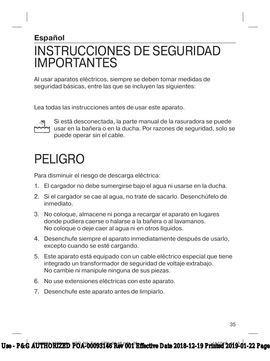 PELIGRO Para disminuir el riesgo de descarga eléctrica: 1. El cargador no debe sumergirse bajo el agua ni usarse en la ducha. 2. Si el cargador se cae al agua, no trate de sacarlo. Desenchúfelo de inmediato. 3. No coloque, almacene ni ponga a recargar el aparato en lugares donde pudiera caerse o halarse a la bañera o al lavamanos. No coloque o deje caer al agua ni en otros líquidos. 4. Desenchufe siempre el aparato inmediatamente después de usarlo, excepto cuando se esté cargando. 5. Este aparato está equipado con un cable eléctrico especial que tiene integrado un transformador de seguridad de voltaje extrabajo. No cambie ni manipule ninguna de sus piezas. 6. No use extensiones eléctricas con este aparato. 7. Desenchufe este aparato antes de limpiarlo.