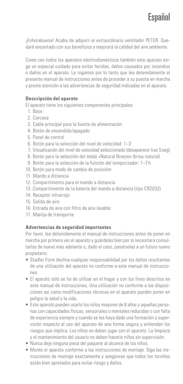33–52 dB(A) CE / WEEE / RoHS / EAC Tutti i diritti relativi a qualsiasi modifica tecnica sono riservati Español ¡Enhorabuena! Acaba de adquirir el extraordinario ventilador PETER. Quedará encantado con sus beneficios y mejorará la calidad del aire ambiente. Como con todos los aparatos electrodomésticos también este aparato exige un especial cuidado para evitar heridas, daños causados por incendios o daños en el aparato. Le rogamos por lo tanto que lea detenidamente el presente manual de instrucciones antes de proceder a su puesta en marcha y preste atención a las advertencias de seguridad indicadas en el aparato. Descripción del aparato El aparato tiene los siguientes componentes principales: