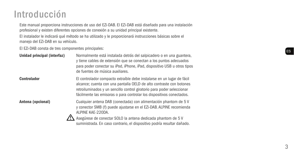 Introducción Este manual proporciona instrucciones de uso del EZi-DAB. El EZi-DAB está diseñado para una instalación profesional y existen diferentes opciones de conexión a su unidad principal existente. El instalador le indicará qué método se ha utilizado y le proporcionará instrucciones básicas sobre el manejo del EZi-DAB en su vehículo. El EZi-DAB consta de tres componentes principales: Unidad principal (interfaz) Normalmente está instalada detrás del salpicadero o en una guantera, y tiene cables de extensión que se conectan a los puntos adecuados para poder conectar su iPod, iPhone, iPad, dispositivo USB u otros tipos de fuentes de música auxiliares. Controlador El controlador compacto extraíble debe instalarse en un lugar de fácil alcance; cuenta con una pantalla OELD de alto contraste con botones retroiluminados y un sencillo control giratorio para poder seleccionar fácilmente las emisoras o para controlar los dispositivos conectados. Antena (opcional) Cualquier antena DAB (conectada) con alimentación phantom de 5 V y conector SMB (f) puede ajustarse en el EZi-DAB. ALPINE recomienda ALPINE KAE-220DA. Asegúrese de conectar SOLO la antena dedicada phantom de 5 V suministrada. En caso contrario, el dispositivo podría resultar dañado.