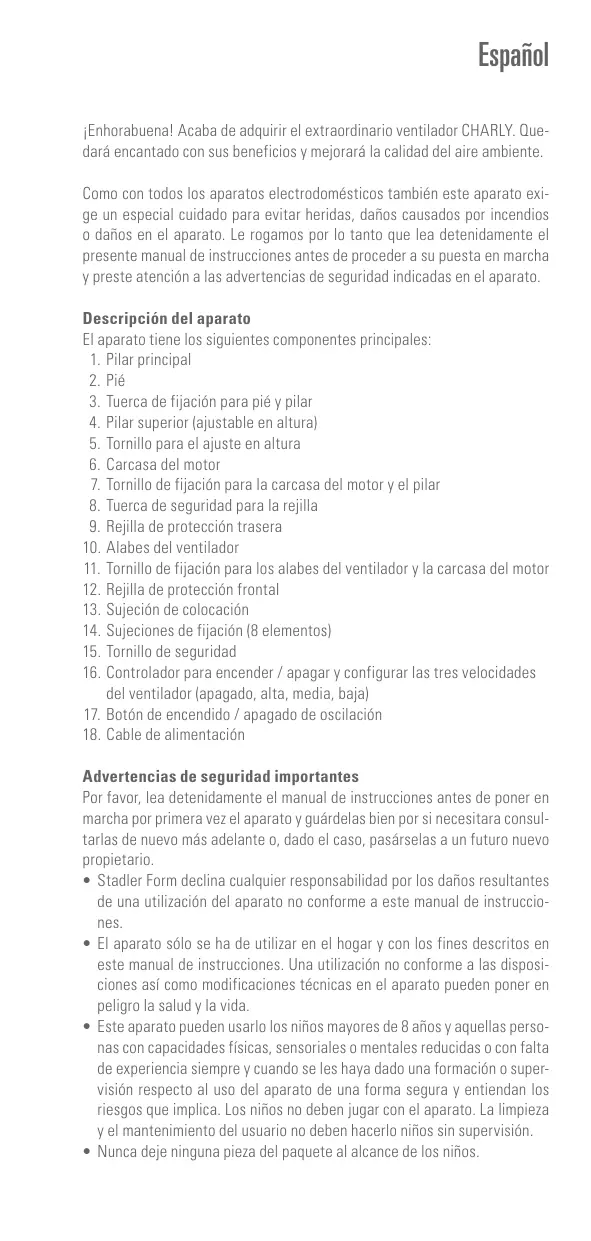 < 56 dB(A) CE / WEEE / RoHS / EAC Tutti i diritti relativi a qualsiasi modifica tecnica sono riservati Español ¡Enhorabuena! Acaba de adquirir el extraordinario ventilador CHARLY. Quedará encantado con sus beneficios y mejorará la calidad del aire ambiente. Como con todos los aparatos electrodomésticos también este aparato exige un especial cuidado para evitar heridas, daños causados por incendios o daños en el aparato. Le rogamos por lo tanto que lea detenidamente el presente manual de instrucciones antes de proceder a su puesta en marcha y preste atención a las advertencias de seguridad indicadas en el aparato. Descripción del aparato El aparato tiene los siguientes componentes principales:
