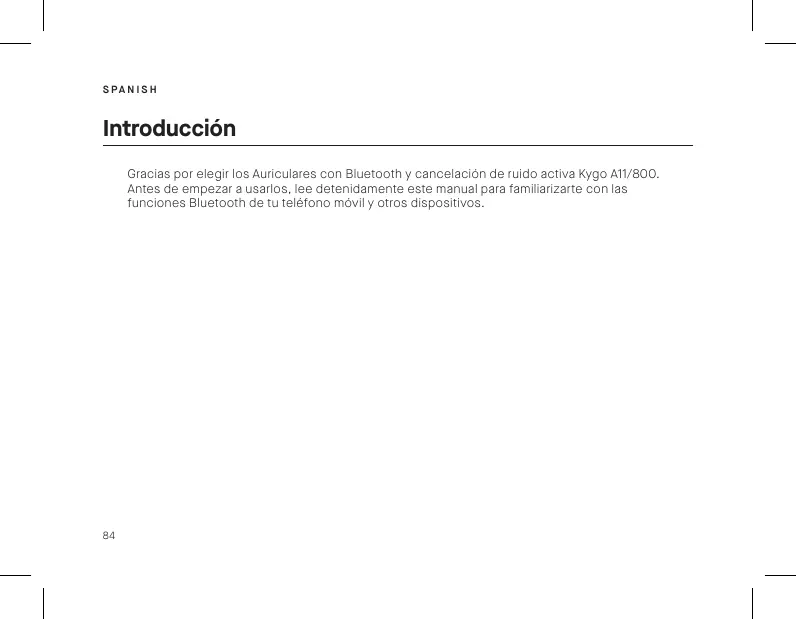 S PA N I S H Introducción Gracias por elegir los Auriculares con Bluetooth y cancelación de ruido activa Kygo A11/800. Antes de empezar a usarlos, lee detenidamente este manual para familiarizarte con las funciones Bluetooth de tu teléfono móvil y otros dispositivos.