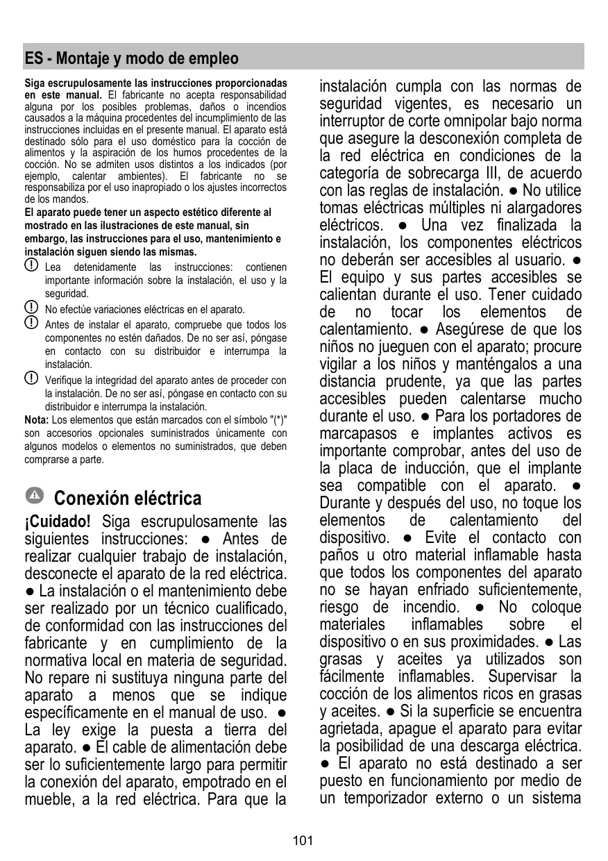 ES - Montaje y modo de empleo instalación cumpla con las normas de seguridad vigentes, es necesario un interruptor de corte omnipolar bajo norma que asegure la desconexión completa de la red eléctrica en condiciones de la categoría de sobrecarga III, de acuerdo con las reglas de instalación. ● No utilice tomas eléctricas múltiples ni alargadores eléctricos. ● Una vez finalizada la instalación, los componentes eléctricos no deberán ser accesibles al usuario. ● El equipo y sus partes accesibles se calientan durante el uso. Tener cuidado de no tocar los elementos de calentamiento. ● Asegúrese de que los niños no jueguen con el aparato; procure vigilar a los niños y manténgalos a una distancia prudente, ya que las partes accesibles pueden calentarse mucho durante el uso. ● Para los portadores de marcapasos e implantes activos es importante comprobar, antes del uso de la placa de inducción, que el implante sea compatible con el aparato. ● Durante y después del uso, no toque los elementos de calentamiento del dispositivo. ● Evite el contacto con paños u otro material inflamable hasta que todos los componentes del aparato no se hayan enfriado suficientemente, riesgo de incendio. ● No coloque materiales inflamables sobre el dispositivo o en sus proximidades. ● Las grasas y aceites ya utilizados son fácilmente inflamables. Supervisar la cocción de los alimentos ricos en grasas y aceites. ● Si la superficie se encuentra agrietada, apague el aparato para evitar la posibilidad de una descarga eléctrica. ● El aparato no está destinado a ser puesto en funcionamiento por medio de un temporizador externo o un sistema