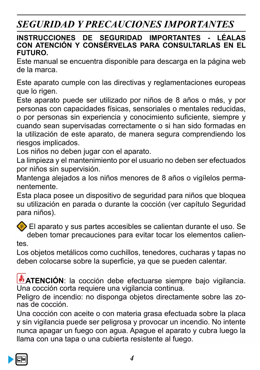 Choix du récipient14 Sélection de foyer13 Mise en Marche - Arrêt15 Réglage de la puissance15 Horizone (selon modèle)16 Réglage de la minuterie16 Verrouillage des commandes17 Fonction SWITCH 17 Fonction ICS17 Fonction RECALL 17 Votre appareil est conforme aux directives et réglementations européennes auxquelles il est soumis. Cet appareil peut être utilisé par des enfants âgés de 8 ans et plus et par des personnes ayant des capacités physiques, sensorielles ou mentales réduites ou des personnes sans expérience et connaissance, si elles sont correctement surveillées ou si elles ont été correctement informées ou formées à l’utilisation de l’appareil en toute sécurité et qu’elles en comprennent les risques qui en résultent. Les enfants ne doivent pas jouer avec l’appareil. Le nettoyage et l’entretien par l’usager ne doivent pas être effectués par des enfants sans surveillance. Les enfants de moins de 8 ans doivent être tenus à l’écart à moins qu’ils ne soient surveillés en permanence. Votre table possède une sécurité enfant qui verrouille son utilisation à l’arrêt ou en cours de cuisson (voir chapitre: utilisation de la sécurité enfant). L’appareil et ses parties accessibles deviennent chauds pendant l’utilisation. Des précautions doivent être prises pour éviter de toucher les éléments chauffants. Les objets métalliques tels que couteaux, fourchettes, cuillères et couvercles ne doivent pas être placés sur la surface, car ils peuvent devenir chauds. ATTENTION : la cuisson doit être surveillée. Une cuisson courte nécessite une surveillance continue. Risque d’incendie : ne pas stocker d’objets sur les zones de cuisson. Une cuisson avec de l’huile ou de la matière grasse effectuée sur une table, et sans surveillance peut être dangereuse et donner lieu à un incendie. Ne tentez JAMAIS d’éteindre un feu avec de l’eau, mais coupez l’alimentation de l’appareil avant de couvrir la flamme avec par exemple un couvercle ou une couverture anti feu. 4