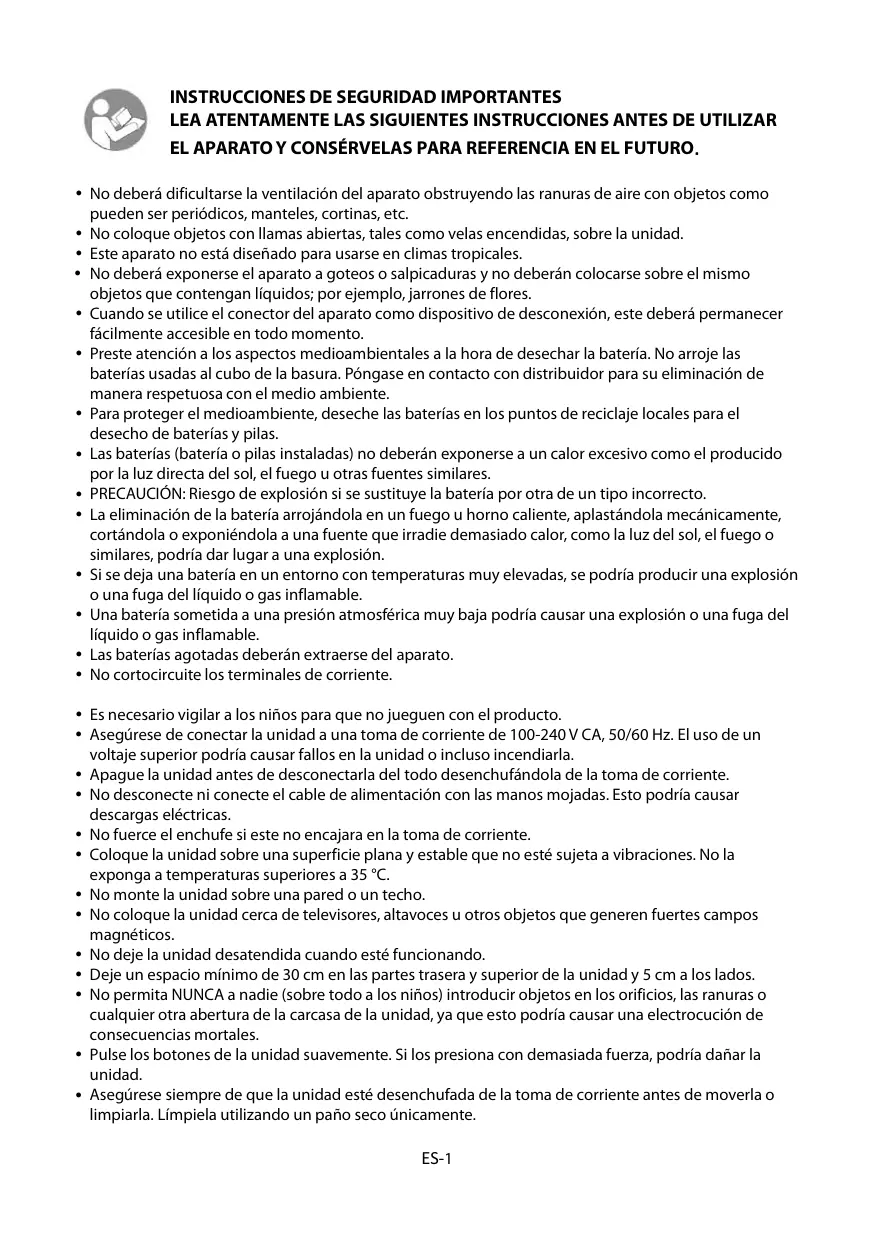 MISES EN GARDE IMPORTANTES MERCI DE BIEN VOULOIR LIRE LES CONSIGNES DE SÉCURITÉ ATTENTIVEMENT AVANT D’UTILISER L'APPAREIL ET CONSERVER POUR RÉFÉRENCE ULTÉRIEURE. Il convient que l’aération ne soit pas gênee par l’obstruction des ouvertures d’aération par des objets tels que journaux, nappes, rideaux, etc. Il convient de ne pas placer sur l’appareil de sources de flammes nues, telles que des bougies allumées. Cet appareil n'est pas destiné à être utilisé sous un climat tropical. L’appareil ne doit pas être exposé á des égouttements d'eau ou des éclaboussures et de plus qu'aucun objet rempli de liquide tel que des vases ne doit être placé sur l’ appareil. Lorsque la prise du une prise placée sur l’appareil est utilisée comme appareil de déconnexion, ce appareil doit demeurer aisément accessible. Il convient d’attirer l’attention sur les problèmes d’environnement dus à la mise au rebut des piles usagées de façon sûre. Déposez-les dans des bacs de collecte prévus pour cet effet (renseignez-vous auprès de votre revendeur afin de protéger l'environnement). Déposez vos piles usagées auprès d'installation de recyclage pour protéger notre environnement. Les piles (piles installées) ne doivent pas être exposées à une chaleur excessive telle que celle du soleil, d'un feu ou d'origine similaire. ATTENTION: Risque d'incendie ou d’explosion si la batterie est remplacée par un type incorrect. Mise au rebut d’une batterie dans un feu ou dans un four chaud, ou écrasement mécanique ou coupure d’une batterie ou être exposées à une chaleur excessive telle que celle du soleil, d'un feu ou d'origine similaire, susceptible de provoquer une explosion. Maintien d’une batterie dans un environnement à très haute température pouvant provoquer une explosion ou la fuite de liquide ou de gaz inflammables. La batterie soumise à une pression de l’air extrêmement faible pouvant provoquer une explosion ou la fuite de liquide ou de gaz inflammables. Les piles usagées doivent être enlevées de l'appareil. Ne pas court-circuiter les piles. Les enfants doivent rester sous surveillance afin de garantir qu’ils ne jouent pas avec l’appareil. Branchez l'appareil dans une prise électrique CA 100-240 V 50/60 Hz. Utiliser une tension supérieure peut provoquer un dysfonctionnement de l’appareil ou un incendie. Éteignez l’appareil avant de le débrancher de la prise électrique pour le mettre complètement hors tension. Ne branchez ni ne débranchez pas le câble d'alimentation avec les mains mouillées. Cela peut provoquer un choc électrique. Si la fiche de l’appareil n’est pas adaptée à votre prise électrique, ne forcez pas pour insérer la fiche dans la prise si elle ne s’insère pas. Placez l'appareil sur une surface plane et stable qui n'est pas soumise aux vibrations. N’exposez pas cet appareil à des températures supérieures à 35 ° C. Ne montez pas ce produit sur un mur ou un plafond. Ne placez pas l’appareil près d’un téléviseur, d’enceintes, ni d’autres objets générant de forts champs magnétiques. Ne laissez pas cet appareil sans surveillance quand il est en fonctionnement. Laissez un espace vide d’au moins 30 cm à l’arrière et au-dessus de l’appareil et d’au moins 5 cm de chaque côté. NE LAISSEZ PERSONNE, notamment les enfants, insérer un objet dans les orifices, fentes et autres ouvertures du boîtier de l’appareil, car cela peut provoquer un choc électrique mortel. Appuyez doucement sur les touches de l’appareil. Appuyer sur les touches trop brutalement peut endommager l’appareil. FR-1