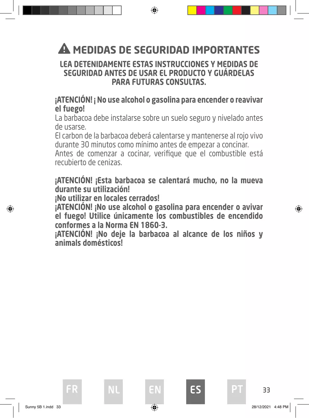 28/12/2021 4:48 PM MEDIDAS DE SEGURIDAD IMPORTANTES LEA DETENIDAMENTE ESTAS INSTRUCCIONES Y MEDIDAS DE SEGURIDAD ANTES DE USAR EL PRODUCTO Y GUÁRDELAS PARA FUTURAS CONSULTAS. ¡ATENCIÓN! ¡ No use alcohol o gasolina para encender o reavivar el fuego! La barbacoa debe instalarse sobre un suelo seguro y nivelado antes de usarse. El carbon de la barbacoa deberá calentarse y mantenerse al rojo vivo durante 30 minutos como mínimo antes de empezar a concinar. Antes de comenzar a cocinar, verifique que el combustible está recubierto de cenizas. ¡ATENCIÓN! ¡Esta barbacoa se calentará mucho, no la mueva durante su utilización! ¡No utilizar en locales cerrados! ¡ATENCIÓN! ¡No use alcohol o gasolina para encender o avivar el fuego! Utilice únicamente los combustibles de encendido conformes a la Norma EN 1860-3. ¡ATENCIÓN! ¡No deje la barbacoa al alcance de los niños y animals domésticos!