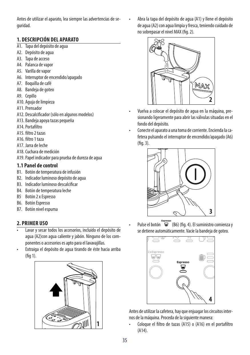 A6. Interruptor de encendido/apagado A7. Boquilla de café A8. Bandeja de goteo A9. Cepillo A10. Aguja de limpieza A11. Prensador A12. Descalcificador (sólo en algunos modelos) (B2) indicador se enciende cuando el depósito de agua está vacío. Llene el depósito de agua con agua fresca. Es normal que haya agua en el espacio debajo del depósito. Por lo tanto, debe secarse regularmente con una esponja limpia.