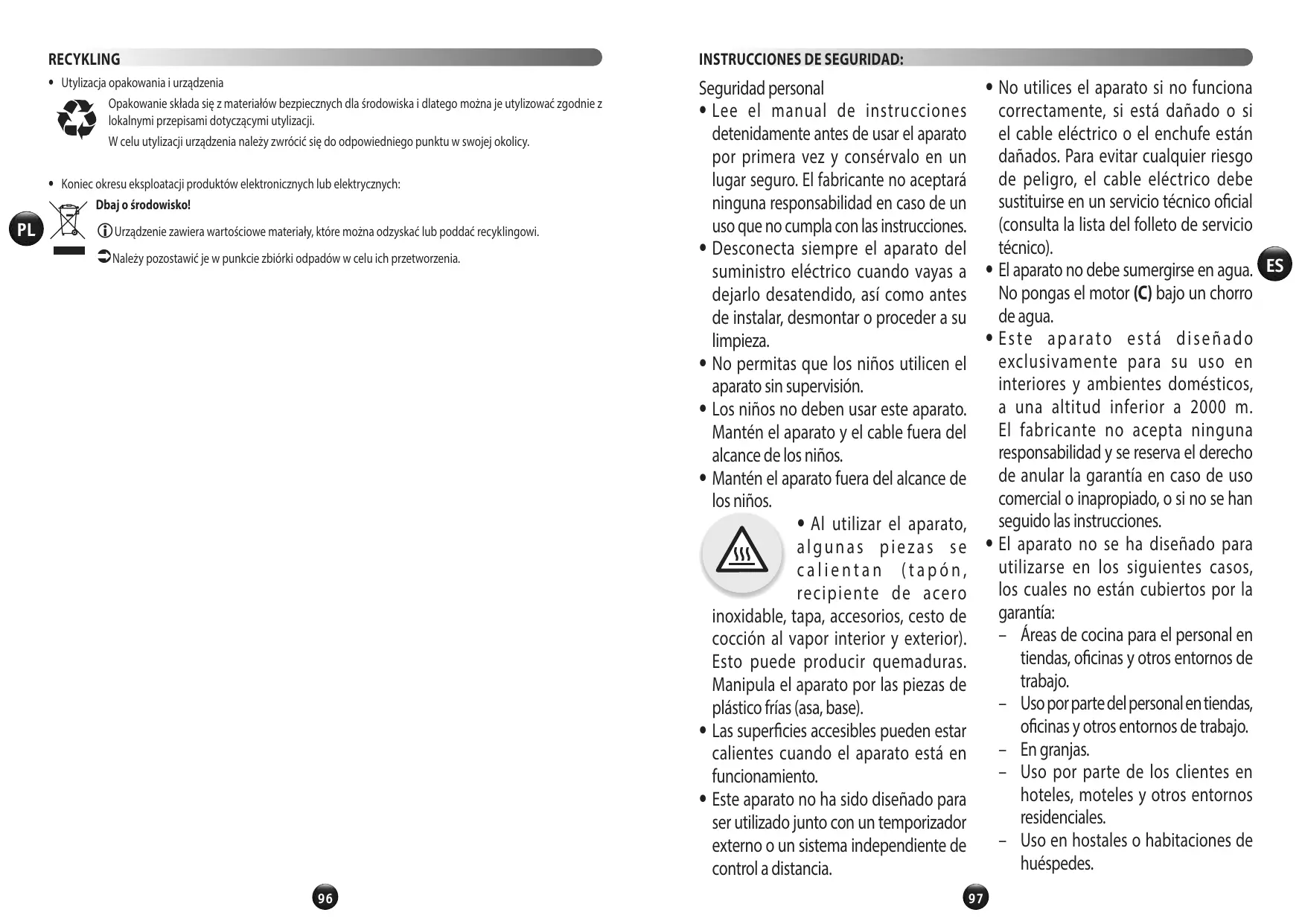 • Lisez attentivement le mode d’emploi avant la première utilisation de votre appareil et conservez-le : une utilisation non conforme au mode d’emploi dégagerait le fabricant de toute responsabilité. • Toujours déconnecter l’appareil de l’alimentation si on le laisse sans surveillance et avant montage, démontage ou nettoyage. • Ne pas laisser les enfants utiliser l’appareil sans surveillance. • Cet appareil ne doit pas être utilisé par les enfants. Conserver l’appareil et son câble hors de portée des enfants. • Maintenez votre appareil hors de portée des enfants. • Lors de l’utilisation de l’appareil, certaines pièces atteignent des températures élevées bouchon, bol inox, couvercle, accessoires, panier vapeur interne et externe. Elles peuvent occasionner des brûlures. Manipulez l’appareil par les pièces plastiques froides (poignée, base). • La température des surfaces accessibles peut être élevée lorsque l’appareil est en fonctionnement. • L’ appareil n’est pas destiné à être mis en fonctionnement au moyen d’une 1