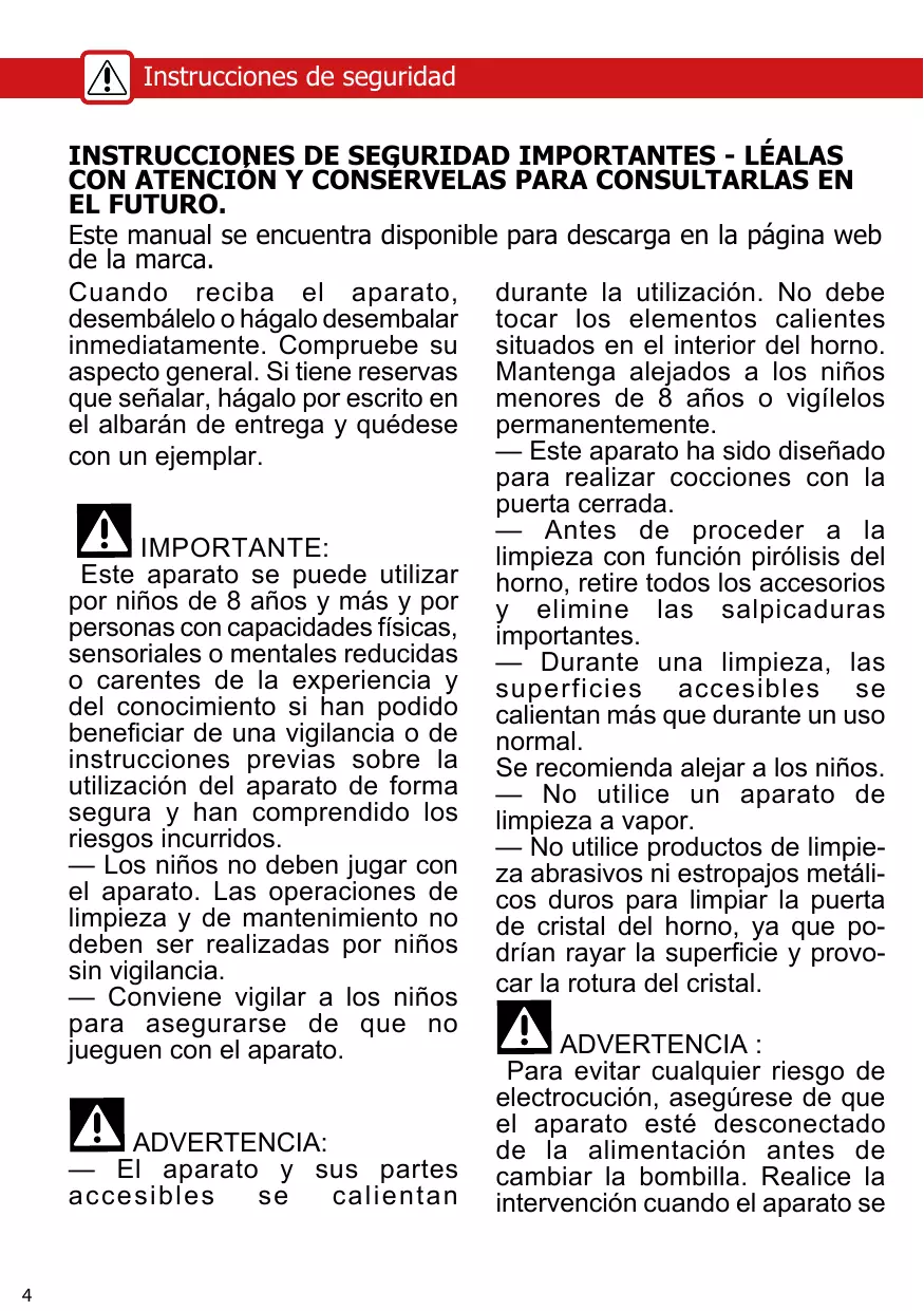 Instrucciones de seguridad INSTRUCCIONES DE SEGURIDAD IMPORTANTES - LÉALAS CON ATENCIÓN Y CONSÉRVELAS PARA CONSULTARLAS EN EL FUTURO. Este manual se encuentra disponible para descarga en la página web de la marca. Cuando reciba el aparato, durante la utilización. No debe desembálelo o hágalo desembalar tocar los elementos calientes inmediatamente. Compruebe su situados en el interior del horno. aspecto general. Si tiene reservas Mantenga alejados a los niños que señalar, hágalo por escrito en menores de 8 años o vigílelos el albarán de entrega y quédese permanentemente. — Este aparato ha sido diseñado con un ejemplar. para realizar cocciones con la puerta cerrada. — Antes de proceder a la IMPORTANTE: limpieza con función pirólisis del Este aparato se puede utilizar horno, retire todos los accesorios por niños de 8 años y más y por y elimine las salpicaduras personas con capacidades físicas, importantes. sensoriales o mentales reducidas — Durante una limpieza, las o carentes de la experiencia y superficies accesibles se del conocimiento si han podido calientan más que durante un uso beneficiar de una vigilancia o de normal. instrucciones previas sobre la Se recomienda alejar a los niños. utilización del aparato de forma — No utilice un aparato de segura y han comprendido los limpieza a vapor. riesgos incurridos. — No utilice productos de limpie— Los niños no deben jugar con za abrasivos ni estropajos metáliel aparato. Las operaciones de cos duros para limpiar la puerta limpieza y de mantenimiento no de cristal del horno, ya que podeben ser realizadas por niños drían rayar la superficie y provosin vigilancia. car la rotura del cristal. — Conviene vigilar a los niños para asegurarse de que no ADVERTENCIA : jueguen con el aparato. Para evitar cualquier riesgo de electrocución, asegúrese de que el aparato esté desconectado ADVERTENCIA: de la alimentación antes de — El aparato y sus partes cambiar la bombilla. Realice la accesibles se calientan intervención cuando el aparato se 4