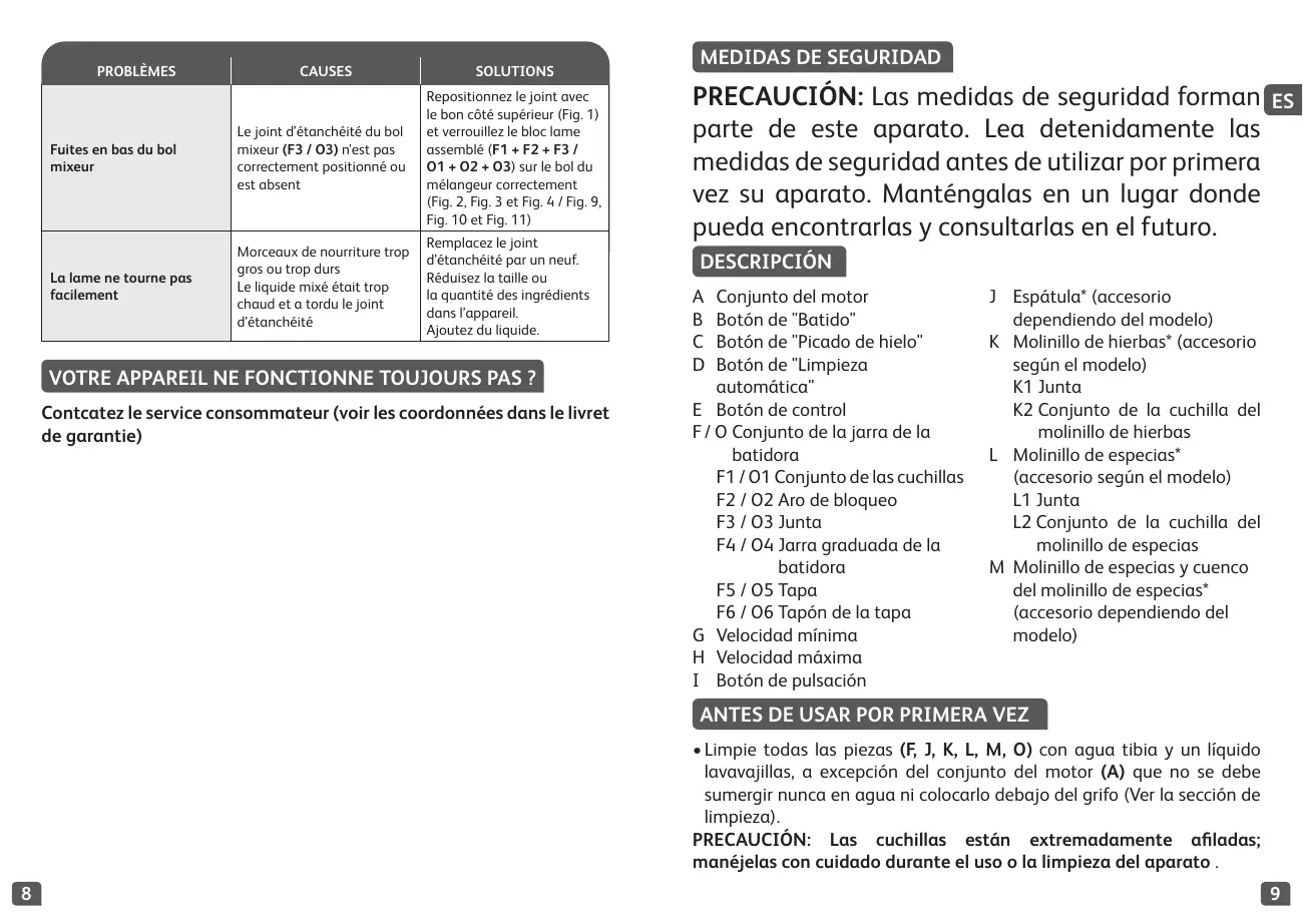 • Coloque la pieza de la cuchilla en el aro de bloqueo (Imagen 1, Imagen7). • Gire la jarra boca abajo y coloque la pieza de la cuchilla con el aro de bloqueo en la base. • Compruebe que el aro de fijación está correctamente bloqueado, es decir, que las dos flechas están alineadas (Fig. 3, Fig. 9). • Agregue los ingredientes a la jarra ya montada sin exceder el nivel máximo indicado. * 1,5 L para mezclas densas * 1,25 L para mezclas líquidas • Función de “ Picado de hielo” Puede usar esta función para picar hielo finamente con ciclos y velocidad de funcionamiento preprogramados. Para usar esta función, presione el botón de "Picado de hielo" (C). La luz permanece iluminada durante este ciclo y se apaga al finalizar el ciclo. El programa termina automáticamente pero puede detenerlo antes del final colocando el botón de control (E) en la posición 0. • Función de "Autolimpieza" Esta función se usa para limpiar automáticamente su aparato. Presione el botón de “Autolimpieza” (D). No exceda 1 litro de agua caliente a una temperatura máxima de 80°C / 176°F. Al final del ciclo, el aparato se detendrá automáticamente y emitirá 4 tonos de aviso. • ATENCIÓN: Si la cantidad es excesiva, su aparato se detendrá automáticamente por razones de seguridad (si el motor está en 11