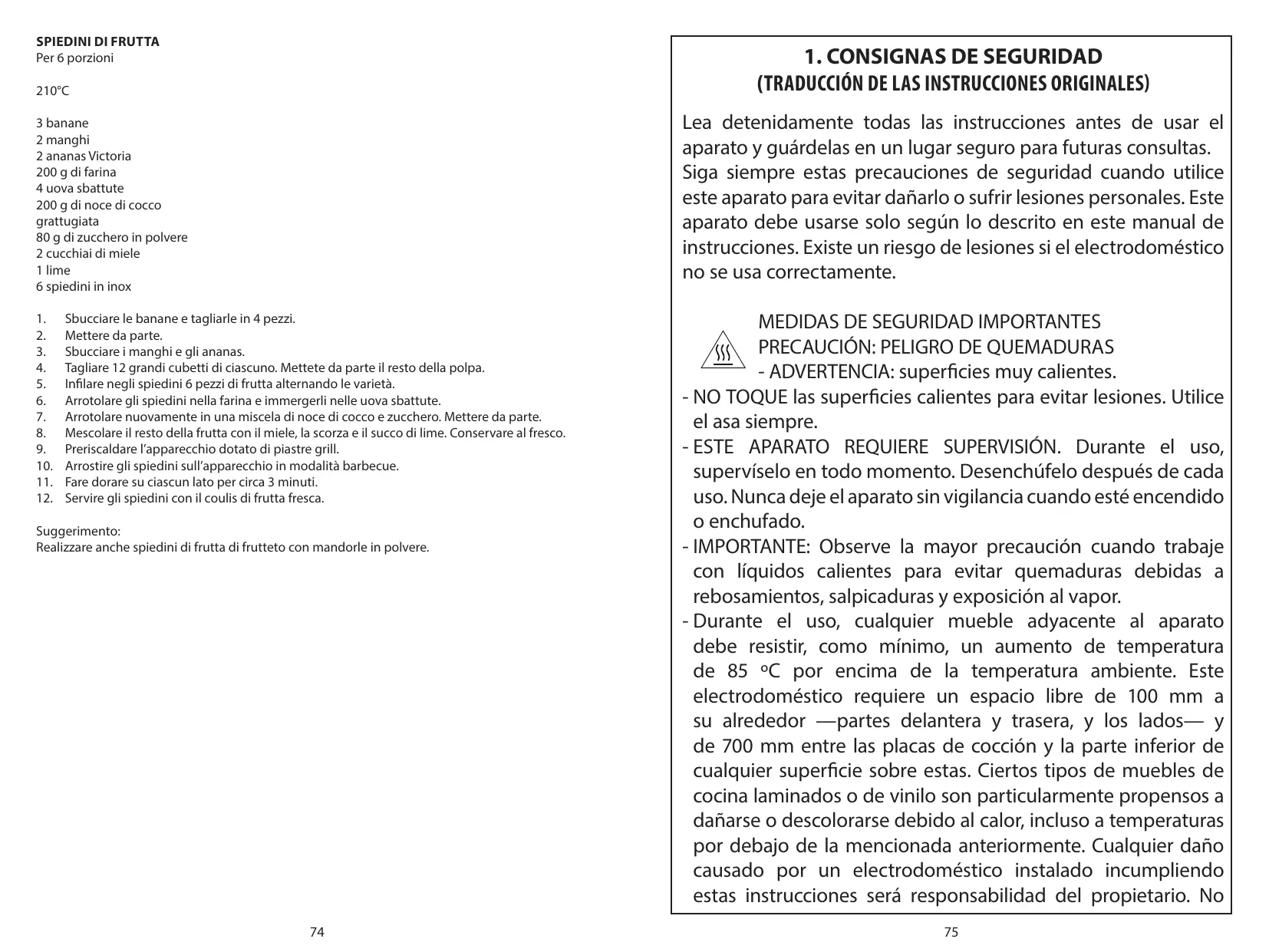 Rol de spiesen vervolgens door een kokos-suikermengsel. Zet apart. Mix de rest van het fruit met de honing en met de schil en het sap van de limoen. Zet in de koelkast. 9. Verwarm het apparaat voor met de grillplaten erop bevestigd. 10. Bak de spiesen rondom op de barbecuestand. 11. Bak elke kant ongeveer 3 minuten. 12. Serveer de spiesen met de frisse fruitsaus. Suggestie: Maak ook eens fruitspiesen met boomgaardfruit en amandelmeel. - No permita que el cable de alimentación entre en contacto con ninguna fuente de calor. - Ya que las superficies exteriores pueden calentarse durante el uso del electrodoméstico, asegúrese de no permitir que dichas
