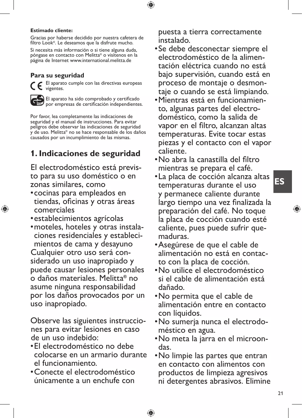 Observe las siguientes instruccio- • No sumerja nunca el electrodones para evitar lesiones en caso méstico en agua. de un uso indebido: • No meta la jarra en el microon• El electrodoméstico no debe das. colocarse en un armario durante • No limpie las partes que entran el funcionamiento. en contacto con alimentos con • Conecte el electrodoméstico productos de limpieza agresivos únicamente a un enchufe con ni detergentes abrasivos. Elimine Estimado cliente: Gracias por haberse decidido por nuestra cafetera de filtro Look®. Le deseamos que la disfrute mucho. Si necesita más información o si tiene alguna duda, póngase en contacto con Melitta® o visítenos en la página de Internet www.international.melitta.de