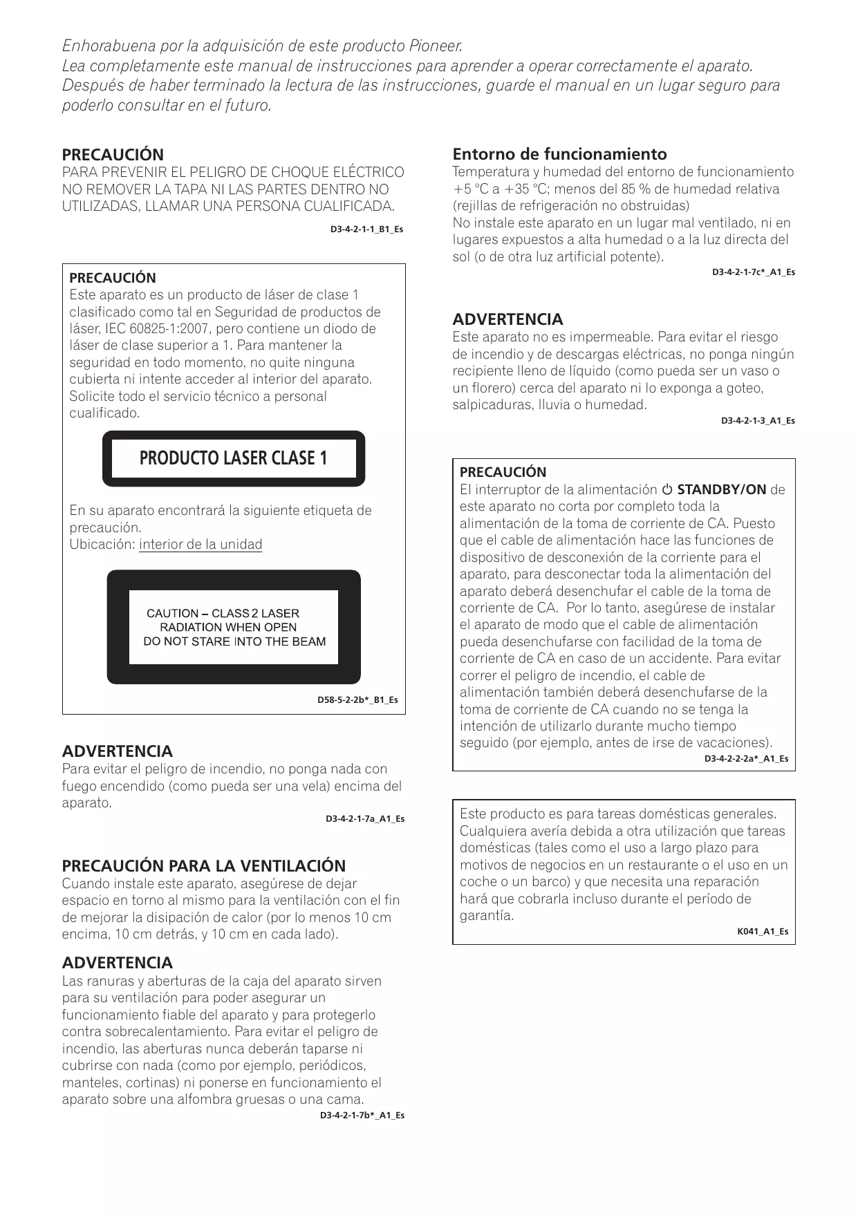 ADVERTENCIA Este aparato no es impermeable. Para evitar el riesgo de incendio y de descargas eléctricas, no ponga ningún recipiente lleno de líquido (como pueda ser un vaso o un florero) cerca del aparato ni lo exponga a goteo, salpicaduras, lluvia o humedad. D3-4-2-1-3_A1_Es