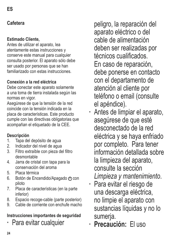 Beste klant El café se puede conservar caliente dentro de la jarra si se mantiene sobre la placatérmica. Después de servir la última taza, pulse para apagar la cafetera. A menos que el aparato se apague manualmente, la placa térmica se mantiene caliente durante 35 minutos después de finalizada la elaboración del café, momento en que el aparato se apagará automáticamente. Apague siempre el aparato después de su utilización y desenchúfelo de la toma de pared. Limpieza y mantenimiento ∙ Antes de limpiar el aparato, asegúrese de que esté desconectado de la red eléctrica y se haya enfriado por completo. ∙ Para evitar el riesgo de una descarga eléctrica, no limpie el aparato con sustancias líquidas y no lo sumerja. La cafetera se podrá limpiar con un paño ligeramente húmedo y un detergente suave. Séquelo a continuación. ∙ No emplee productos de limpieza abrasivos o muy fuertes. ∙ Para extraer el café molido usado, abra el filtro extraíble y extraiga hacia arriba el filtro desmontable. Deshágase del café molido (al tratarse de una sustancia natural, puede utilizarse como abono). ∙ Enjuague el filtro desmontable, séquelo con un paño y vuelva a colocarlo. ∙ Es muy difícil eliminar la acumulación excesiva de depósitos de cal, aun cuando se usan agentes desincrustadores muy fuertes. También podrían producirse fugas en el equipo de elaboración del café. Por ello recomendamos que la cafetera se desincruste cada treinta o cuarenta ciclos de elaboración de café. Para el desincrustado se podrá usar una mezcla 28