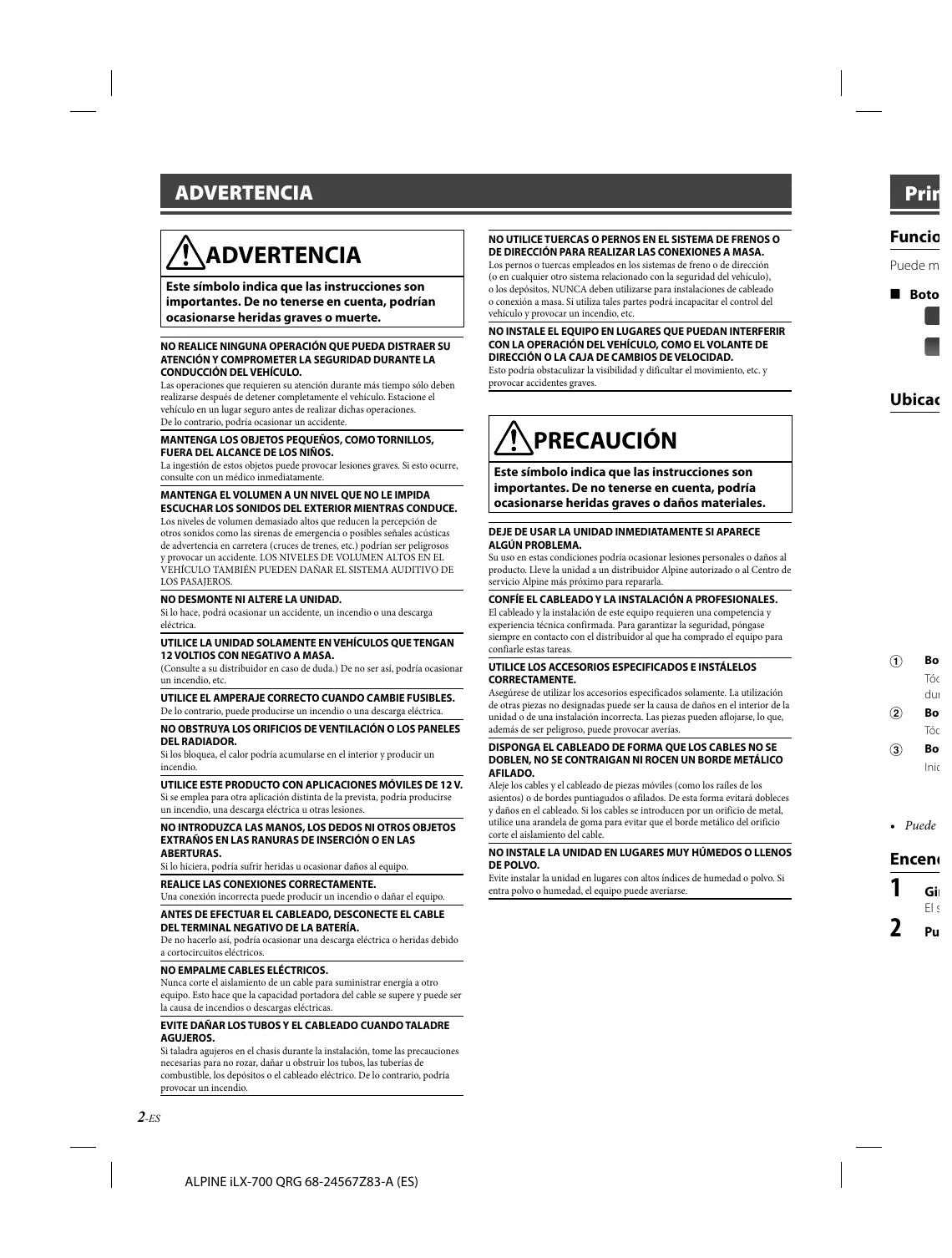 FECHA DE INSTALACIÓN: INSTALADOR: LUGAR DE ADQUISICIÓN: Para obtener información sobre todas las funciones, consulte el Manual de instrucciones publicado en nuestro sitio web: http://www.alpine-europe.com. Si es necesario, un distribuidor de ALPINE le facilitará una copia en papel del Manual de instrucciones publicado en nuestro sitio web. 1-ES ADVERTENCIA Este símbolo indica que las instrucciones son importantes. De no tenerse en cuenta, podrían ocasionarse heridas graves o muerte. NO REALICE NINGUNA OPERACIÓN QUE PUEDA DISTRAER SU ATENCIÓN Y COMPROMETER LA SEGURIDAD DURANTE LA CONDUCCIÓN DEL VEHÍCULO. Las operaciones que requieren su atención durante más tiempo sólo deben realizarse después de detener completamente el vehículo. Estacione el vehículo en un lugar seguro antes de realizar dichas operaciones. De lo contrario, podría ocasionar un accidente. MANTENGA LOS OBJETOS PEQUEÑOS, COMO TORNILLOS, FUERA DEL ALCANCE DE LOS NIÑOS. La ingestión de estos objetos puede provocar lesiones graves. Si esto ocurre, consulte con un médico inmediatamente. MANTENGA EL VOLUMEN A UN NIVEL QUE NO LE IMPIDA ESCUCHAR LOS SONIDOS DEL EXTERIOR MIENTRAS CONDUCE. Los niveles de volumen demasiado altos que reducen la percepción de otros sonidos como las sirenas de emergencia o posibles señales acústicas de advertencia en carretera (cruces de trenes, etc.) podrían ser peligrosos y provocar un accidente. LOS NIVELES DE VOLUMEN ALTOS EN EL VEHÍCULO TAMBIÉN PUEDEN DAÑAR EL SISTEMA AUDITIVO DE LOS PASAJEROS. Prim NO UTILICE TUERCAS O PERNOS EN EL SISTEMA DE FRENOS O DE DIRECCIÓN PARA REALIZAR LAS CONEXIONES A MASA. Funcio Los pernos o tuercas empleados en los sistemas de freno o de dirección (o en cualquier otro sistema relacionado con la seguridad del vehículo), o los depósitos, NUNCA deben utilizarse para instalaciones de cableado o conexión a masa. Si utiliza tales partes podrá incapacitar el control del vehículo y provocar un incendio, etc. Puede m NO INSTALE EL EQUIPO EN LUGARES QUE PUEDAN INTERFERIR CON LA OPERACIÓN DEL VEHÍCULO, COMO EL VOLANTE DE DIRECCIÓN O LA CAJA DE CAMBIOS DE VELOCIDAD. Esto podría obstaculizar la visibilidad y dificultar el movimiento, etc. y provocar accidentes graves. Ubicac PRECAUCIÓN Este símbolo indica que las instrucciones son importantes. De no tenerse en cuenta, podría ocasionarse heridas graves o daños materiales. DEJE DE USAR LA UNIDAD INMEDIATAMENTE SI APARECE ALGÚN PROBLEMA. Su uso en estas condiciones podría ocasionar lesiones personales o daños al producto. Lleve la unidad a un distribuidor Alpine autorizado o al Centro de servicio Alpine más próximo para repararla. CONFÍE EL CABLEADO Y LA INSTALACIÓN A PROFESIONALES. Si lo hace, podrá ocasionar un accidente, un incendio o una descarga eléctrica. El cableado y la instalación de este equipo requieren una competencia y experiencia técnica confirmada. Para garantizar la seguridad, póngase siempre en contacto con el distribuidor al que ha comprado el equipo para confiarle estas tareas. UTILICE LA UNIDAD SOLAMENTE EN VEHÍCULOS QUE TENGAN 12 VOLTIOS CON NEGATIVO A MASA. (Consulte a su distribuidor en caso de duda.) De no ser así, podría ocasionar un incendio, etc. UTILICE EL AMPERAJE CORRECTO CUANDO CAMBIE FUSIBLES. De lo contrario, puede producirse un incendio o una descarga eléctrica. NO OBSTRUYA LOS ORIFICIOS DE VENTILACIÓN O LOS PANELES DEL RADIADOR. Si los bloquea, el calor podría acumularse en el interior y producir un incendio. UTILICE ESTE PRODUCTO CON APLICACIONES MÓVILES DE 12 V. Si se emplea para otra aplicación distinta de la prevista, podría producirse un incendio, una descarga eléctrica u otras lesiones. NO INTRODUZCA LAS MANOS, LOS DEDOS NI OTROS OBJETOS EXTRAÑOS EN LAS RANURAS DE INSERCIÓN O EN LAS ABERTURAS. Si lo hiciera, podría sufrir heridas u ocasionar daños al equipo. REALICE LAS CONEXIONES CORRECTAMENTE. Una conexión incorrecta puede producir un incendio o dañar el equipo. ANTES DE EFECTUAR EL CABLEADO, DESCONECTE EL CABLE DEL TERMINAL NEGATIVO DE LA BATERÍA. De no hacerlo así, podría ocasionar una descarga eléctrica o heridas debido a cortocircuitos eléctricos. NO EMPALME CABLES ELÉCTRICOS. Nunca corte el aislamiento de un cable para suministrar energía a otro equipo. Esto hace que la capacidad portadora del cable se supere y puede ser la causa de incendios o descargas eléctricas. EVITE DAÑAR LOS TUBOS Y EL CABLEADO CUANDO TALADRE AGUJEROS. Si taladra agujeros en el chasis durante la instalación, tome las precauciones necesarias para no rozar, dañar u obstruir los tubos, las tuberías de combustible, los depósitos o el cableado eléctrico. De lo contrario, podría provocar un incendio. 2-ES UTILICE LOS ACCESORIOS ESPECIFICADOS E INSTÁLELOS CORRECTAMENTE. Asegúrese de utilizar los accesorios especificados solamente. La utilización de otras piezas no designadas puede ser la causa de daños en el interior de la unidad o de una instalación incorrecta. Las piezas pueden aflojarse, lo que, además de ser peligroso, puede provocar averías. DISPONGA EL CABLEADO DE FORMA QUE LOS CABLES NO SE DOBLEN, NO SE CONTRAIGAN NI ROCEN UN BORDE METÁLICO AFILADO. Aleje los cables y el cableado de piezas móviles (como los raíles de los asientos) o de bordes puntiagudos o afilados. De esta forma evitará dobleces y daños en el cableado. Si los cables se introducen por un orificio de metal, utilice una arandela de goma para evitar que el borde metálico del orificio corte el aislamiento del cable. NO INSTALE LA UNIDAD EN LUGARES MUY HÚMEDOS O LLENOS DE POLVO. Evite instalar la unidad en lugares con altos índices de humedad o polvo. Si entra polvo o humedad, el equipo puede averiarse.