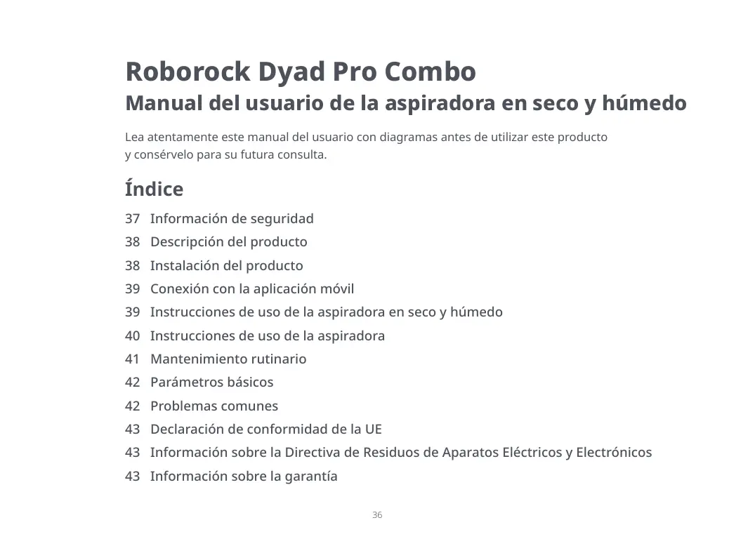 Roborock Dyad Pro Combo Manual del usuario de la aspiradora en seco y húmedo Lea atentamente este manual del usuario con diagramas antes de utilizar este producto y consérvelo para su futura consulta. Índice 37 Información de seguridad 38 Descripción del producto 38 Instalación del producto 39 Conexión con la aplicación móvil 39 Instrucciones de uso de la aspiradora en seco y húmedo 40 Instrucciones de uso de la aspiradora 41 Mantenimiento rutinario 42 Parámetros básicos 42 Problemas comunes 43 Declaración de conformidad de la UE 43 Información sobre la Directiva de Residuos de Aparatos Eléctricos y Electrónicos 43 Información sobre la garantía