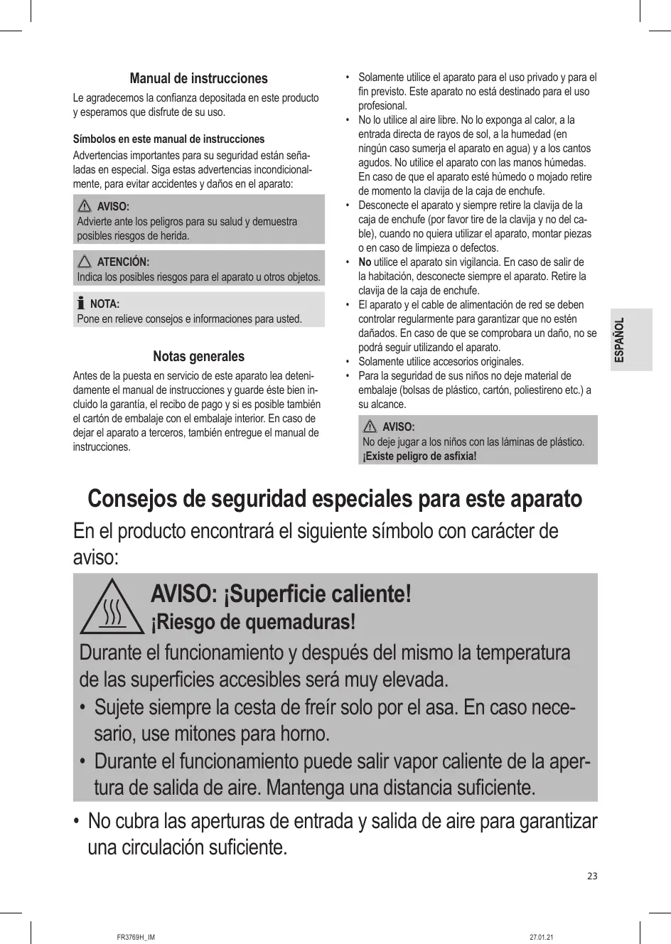 AVISO: Advierte ante los peligros para su salud y demuestra posibles riesgos de herida. ATENCIÓN: • No utilice el aparato sin vigilancia. En caso de salir de la habitación, desconecte siempre el aparato. Retire la clavija de la caja de enchufe. • El aparato y el cable de alimentación de red se deben controlar regularmente para garantizar que no estén dañados. En caso de que se comprobara un daño, no se podrá seguir utilizando el aparato. • Solamente utilice accesorios originales. • Para la seguridad de sus niños no deje material de embalaje (bolsas de plástico, cartón, poliestireno etc.) a su alcance. AVISO: No deje jugar a los niños con las láminas de plástico. ¡Existe peligro de asfixia!