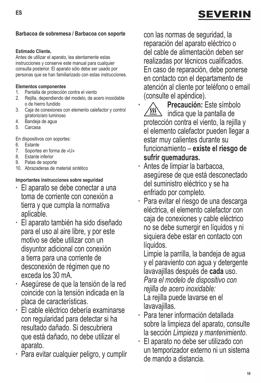 ∙ Monte la barbacoa tal y como se indica en los diagramas: ∙ Coloque la bandeja de agua en la carcasa de la barbacoa. ∙ Instale el elemento calefactor con la caja de conexiones en la bandeja de agua. El aparato cuenta con un interruptor de seguridad. El aparato solo puede funcionar con la caja de conexiones correctamente instalada. ∙ Ponga la rejilla. ∙ Solo cuando utilice el dispositivo en el exterior, instale los ganchos de la pantalla de protección contra el viento en los orificios, primero laterales y después en los posteriores, de la bandeja de agua. Montaje del soporte de la base ∙ Para los modelos de barbacoa con soporte de la base, monte el soporte tal y como se indica en el diagrama: ∙ Conecte las cuatro abrazaderas de material sintético en las cuatro patas de soporte. ∙ Instale las patas de soporte en los soportes en forma de «U». ∙ Instale el estante inferior y utilice los ocho tornillos y tuercas de mariposa para fijarlo. ∙ Coloque el estante. ∙ Compruebe que el soporte está estable. ∙ Coloque encima la barbacoa montada. ∙ Los residuos de agua, grasa y especias pueden dañar el material de la bandeja de agua. La garantía quedará anulada si la bandeja de agua se daña por falta de limpieza. ∙ Antes de limpiar la barbacoa, asegúrese de que está desconectado del suministro eléctrico y se ha enfriado por completo. ∙ No utilice estropajos metálicos ni productos limpiadores abrasivos. ∙ Retire la pantalla de protección contra el viento y la rejilla y límpielas con agua y jabón; también puede dejarlas en remojo durante un tiempo. ∙ Retire el elemento calefactor con caja de conexiones. Para evitar el riesgo de una descarga eléctrica, no limpie el elemento calefactor con agua y no lo sumerja en agua. El elemento calefactor con caja de conexiones se puede limpiar con un paño sin pelusa, ligeramente húmedo. ∙ Retire la bandeja de agua y límpiela en el agua con detergente lavavajillas, si es necesario déjela en remojo brevemente. ∙ Las otras partes se pueden limpiar con un paño humedecido en agua y jabón, y secarse por completo después. Eliminación Los dispositivos en los que figura este símbolo deben ser eliminados por separado de la basura doméstica, porque contienen componentes valiosos que pueden ser reciclados. La eliminación correcta ayuda a proteger el medio ambiente y la salud de las personas. Consulte a las autoridades municipales o el establecimiento de venta donde podrán facilitarle la información relevante. Los aparatos eléctricos que ya no son utilizables se pueden entregar gratuitamente en el establecimiento de venta. 22