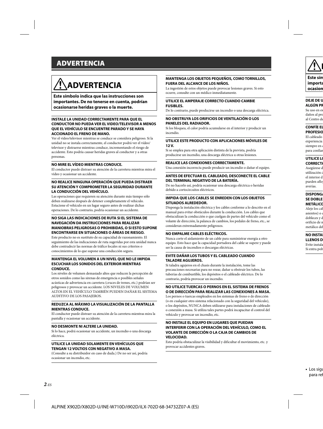 1-ES ADVERTENCIA Este símbolo indica que las instrucciones son importantes. De no tenerse en cuenta, podrían ocasionarse heridas graves o la muerte. INSTALE LA UNIDAD CORRECTAMENTE PARA QUE EL CONDUCTOR NO PUEDA VER EL VIDEO/TELEVISOR A MENOS QUE EL VEHÍCULO SE ENCUENTRE PARADO Y SE HAYA ACCIONADO EL FRENO DE MANO. Ver el vídeo/televisor mientras se conduce se considera peligroso. Si la unidad no se instala correctamente, el conductor podrá ver el vídeo/ televisor y distraerse mientras conduce, incrementando el riesgo de accidente. Esto podría causar heridas graves al conductor y a otras personas. NO MIRE EL VÍDEO MIENTRAS CONDUCE. El conductor puede distraer su atención de la carretera mientras mira el vídeo y ocasionar un accidente. NO REALICE NINGUNA OPERACIÓN QUE PUEDA DISTRAER SU ATENCIÓN Y COMPROMETER LA SEGURIDAD DURANTE LA CONDUCCIÓN DEL VEHÍCULO. Las operaciones que requieren su atención durante más tiempo sólo deben realizarse después de detener completamente el vehículo. Estacione el vehículo en un lugar seguro antes de realizar dichas operaciones. De lo contrario, podría ocasionar un accidente. NO SIGA LAS INDICACIONES DE RUTA SI EL SISTEMA DE