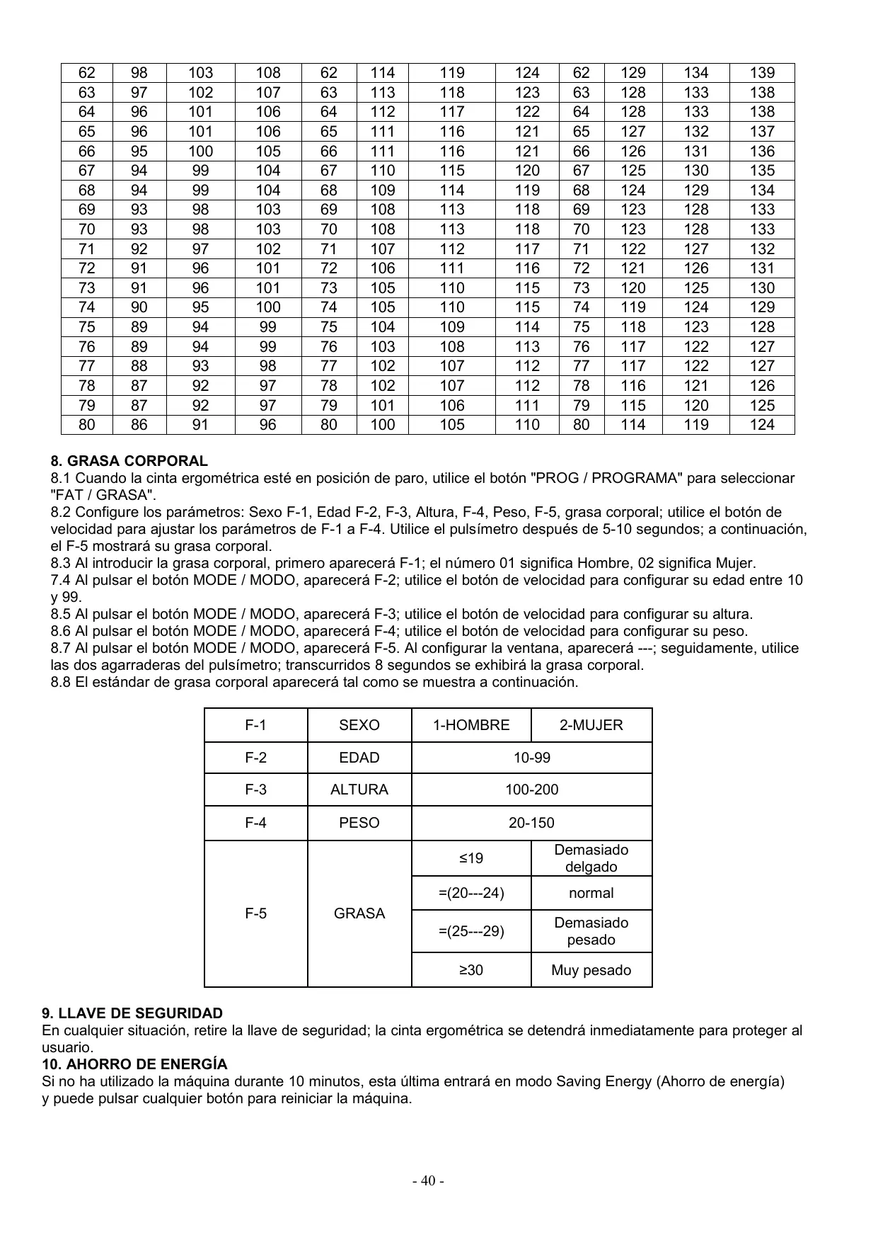 8. GRASA CORPORAL 8.1 Cuando la cinta ergométrica esté en posición de paro, utilice el botón "PROG / PROGRAMA" para seleccionar "FAT / GRASA". 8.2 Configure los parámetros: Sexo F-1, Edad F-2, F-3, Altura, F-4, Peso, F-5, grasa corporal; utilice el botón de velocidad para ajustar los parámetros de F-1 a F-4. Utilice el pulsímetro después de 5-10 segundos; a continuación, el F-5 mostrará su grasa corporal. 8.3 Al introducir la grasa corporal, primero aparecerá F-1; el número 01 significa Hombre, 02 significa Mujer. 7.4 Al pulsar el botón MODE / MODO, aparecerá F-2; utilice el botón de velocidad para configurar su edad entre 10 y 99. 8.5 Al pulsar el botón MODE / MODO, aparecerá F-3; utilice el botón de velocidad para configurar su altura. 8.6 Al pulsar el botón MODE / MODO, aparecerá F-4; utilice el botón de velocidad para configurar su peso. 8.7 Al pulsar el botón MODE / MODO, aparecerá F-5. Al configurar la ventana, aparecerá ---; seguidamente, utilice las dos agarraderas del pulsímetro; transcurridos 8 segundos se exhibirá la grasa corporal. 8.8 El estándar de grasa corporal aparecerá tal como se muestra a continuación. F-1