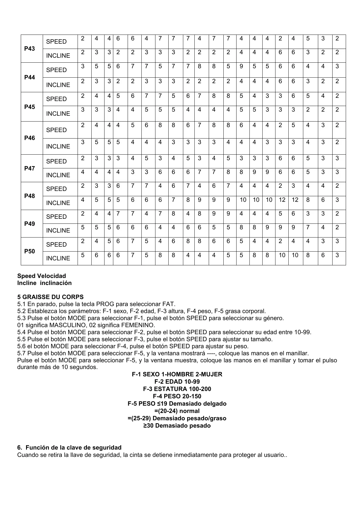 Speed Velocidad Incline inclinación 5 GRAISSE DU CORPS 5.1 En parado, pulse la tecla PROG para seleccionar FAT. 5.2 Establezca los parámetros: F-1 sexo, F-2 edad, F-3 altura, F-4 peso, F-5 grasa corporal. 5.3 Pulse el botón MODE para seleccionar F-1, pulse el botón SPEED para seleccionar su género. 01 significa MASCULINO, 02 significa FEMENINO. 5.4 Pulse el botón MODE para seleccionar F-2, pulse el botón SPEED para seleccionar su edad entre 10-99. 5.5 Pulse el botón MODE para seleccionar F-3, pulse el botón SPEED para ajustar su tamaño. 5.6 el botón MODE para seleccionar F-4, pulse el botón SPEED para ajustar su peso. 5.7 Pulse el botón MODE para seleccionar F-5, y la ventana mostrará ----, coloque las manos en el manillar. Pulse el botón MODE para seleccionar F-5, y la ventana muestra, coloque las manos en el manillar y tomar el pulso durante más de 10 segundos. F-1 SEXO 1-HOMBRE 2-MUJER F-2 EDAD 10-99 F-3 ESTATURA 100-200 F-4 PESO 20-150 F-5 PESO ≤19 Demasiado delgado =(20-24) normal =(25-29) Demasiado pesado/graso ≥30 Demasiado pesado