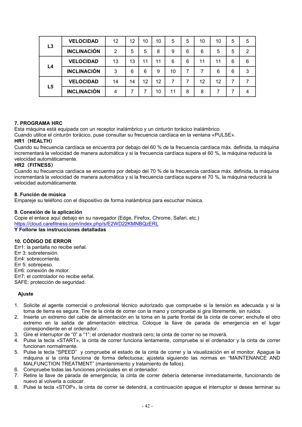 10. CÓDIGO DE ERROR Err1: la pantalla no recibe señal. Err 3: sobretensión. Err4: sobrecorriente. 3. Gire el interruptor de “0” a “1”; el ordenador mostrará cero; la cinta de correr no se moverá. 4. Pulse la tecla «START», la cinta de correr funciona lentamente, compruebe si el ordenador y la cinta de correr funcionan normalmente. 5. Pulse la tecla “SPEED” y compruebe el estado de la cinta de correr y la visualización en el monitor. Apague la máquina si la cinta funciona de forma defectuosa; ajústela siguiendo las normas en “MAINTENANCE AND MALFUNCTION TREATMENT” (mantenimiento y tratamiento de fallos). 6. Compruebe todas las funciones principales en el ordenador. 7. Retire la llave de parada de emergencia; la cinta de correr debería detenerse inmediatamente, funcionando de nuevo al volverla a colocar. 8. Pulse la tecla «STOP», la cinta de correr se detendrá, a continuación apague el interruptor si desea terminar su - 42 -