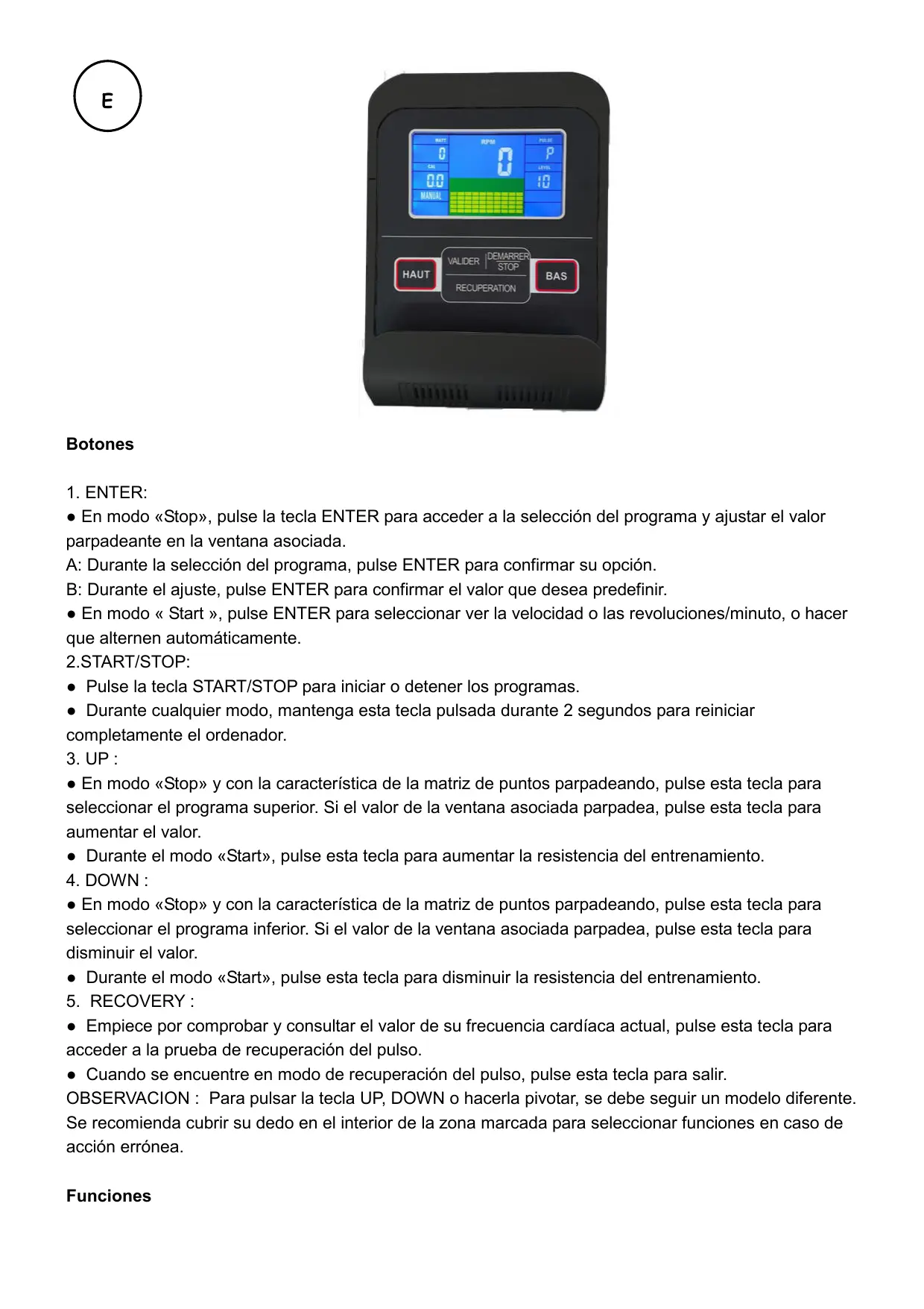 ● En modo «Stop», pulse la tecla ENTER para acceder a la selección del programa y ajustar el valor parpadeante en la ventana asociada. A: Durante la selección del programa, pulse ENTER para confirmar su opción. B: Durante el ajuste, pulse ENTER para confirmar el valor que desea predefinir. ● En modo « Start », pulse ENTER para seleccionar ver la velocidad o las revoluciones/minuto, o hacer que alternen automáticamente. 2.START/STOP: ● Pulse la tecla START/STOP para iniciar o detener los programas. ● Durante cualquier modo, mantenga esta tecla pulsada durante 2 segundos para reiniciar completamente el ordenador.
