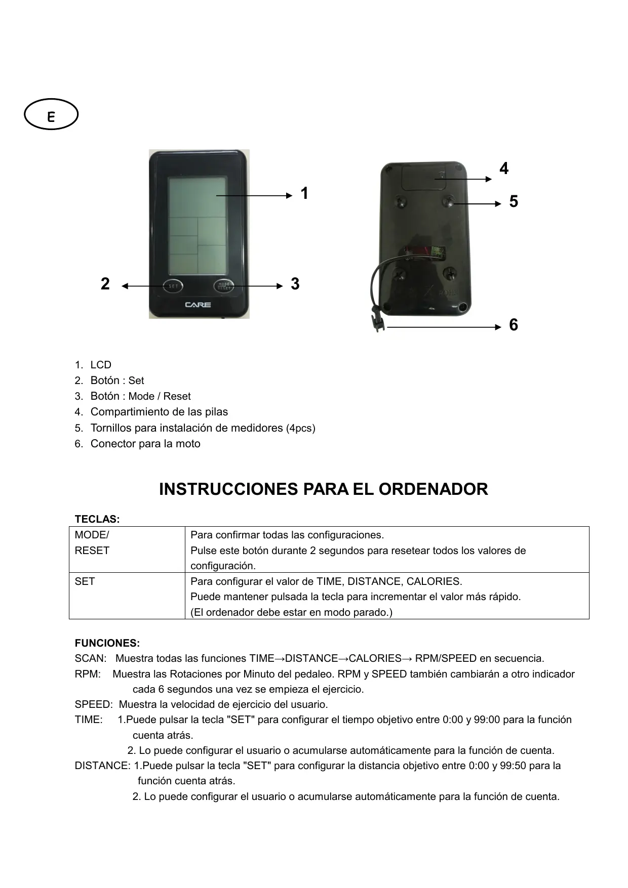 FUNCIONES: SCAN: Muestra todas las funciones TIME→DISTANCE→CALORIES→ RPM/SPEED en secuencia. RPM: Muestra las Rotaciones por Minuto del pedaleo. RPM y SPEED también cambiarán a otro indicador cada 6 segundos una vez se empieza el ejercicio. SPEED: Muestra la velocidad de ejercicio del usuario. TIME: 1.Puede pulsar la tecla "SET" para configurar el tiempo objetivo entre 0:00 y 99:00 para la función cuenta atrás. 2. Lo puede configurar el usuario o acumularse automáticamente para la función de cuenta. DISTANCE: 1.Puede pulsar la tecla "SET" para configurar la distancia objetivo entre 0:00 y 99:50 para la función cuenta atrás. 2. Lo puede configurar el usuario o acumularse automáticamente para la función de cuenta.