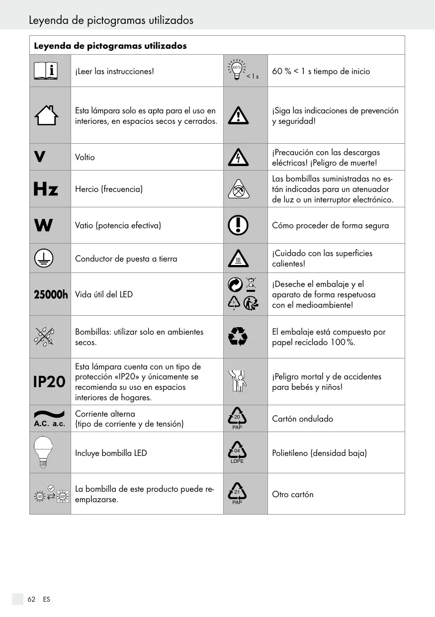 Esta lámpara solo es apta para el uso en interiores, en espacios secos y cerrados. Puede montarse sobre todas las superficies inflamables normales. Este aparato ha sido diseñado exclusivamente para uso doméstico. Este producto ha sido diseñado para un uso normal.