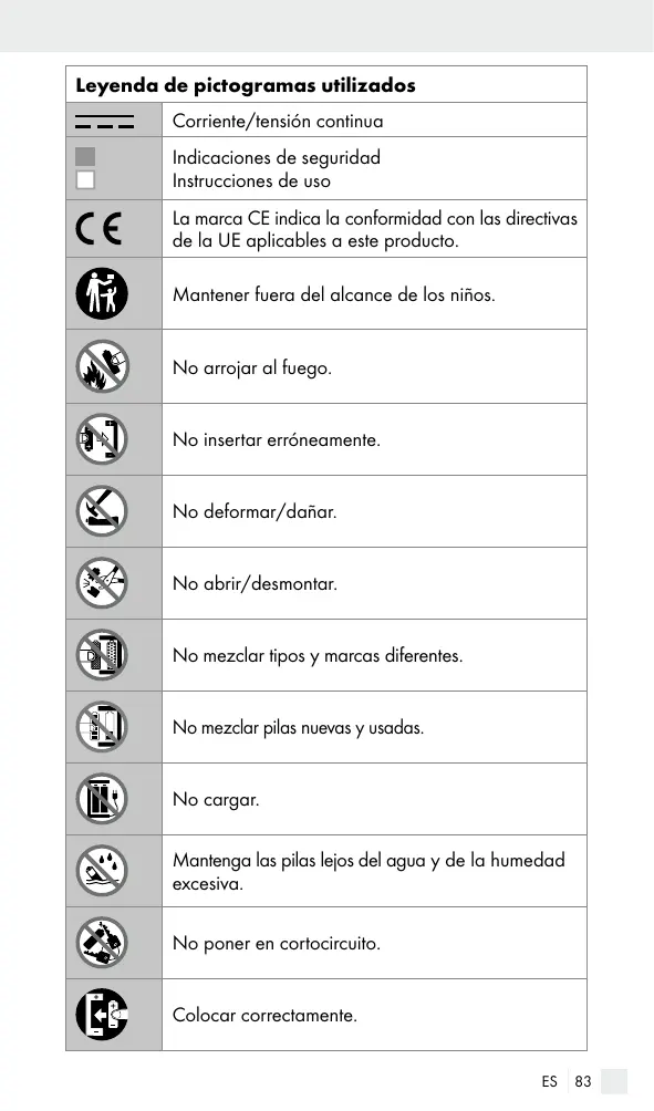La marque CE indique la conformité aux directives européennes applicables à ce produit. À conserver hors de la portée des enfants Ne pas jeter au feu Veiller à une insertion correcte Ne pas déformer/détériorer Ne pas ouvrir/démonter Ne pas mélanger des types et des marques différents Ne pas mélanger des piles usées et des piles neuves Ne pas recharger Tenez les piles éloignées de l’eau et d’une humidité excessive. Ne pas court-circuiter Insérer correctement 28