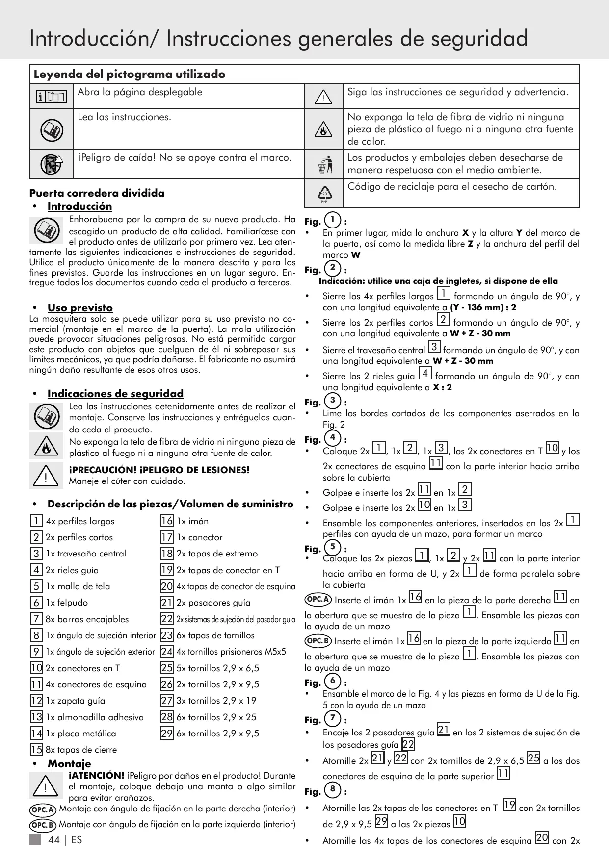 Fig. 29 : Fig. 14 : • Realice 3x marcas para hacer un agujero: en el lado ancho de • Coloque la puerta en posición de cierre y presione la esquina con la placa de metal contra el marco de la puerta. Abra la los 2 rieles guía 4 a una distancia de 4 mm del borde superior, puerta a 4 cm del borde exterior y en el centro de estas dos marcas Fig. 30 : Guarde el recibo original en un lugar seguro. Este documento es necesario como comprobante de compra. Si se detecta un defecto de material o de fabricación en un plazo de tres años a partir de la fecha de compra de este producto, reemplazaremos el producto a nuestra elección de manera gratuita. En este caso, la garantía comenzará de nuevo (solo aplicable en Polonia y Portugal). Esta garantía es nula si el producto se daña, se utiliza incorrectamente o se repara. La garantía se aplica a defectos de material o de fabricación. Esta garantía no cubre las partes del producto expuestas a un desgaste normal (por ejemplo, a la intemperie) y, por tanto, pueden considerarse piezas de desgaste o daños la tela desgarrada por un uso intenso (estiramiento u objetos afilados).