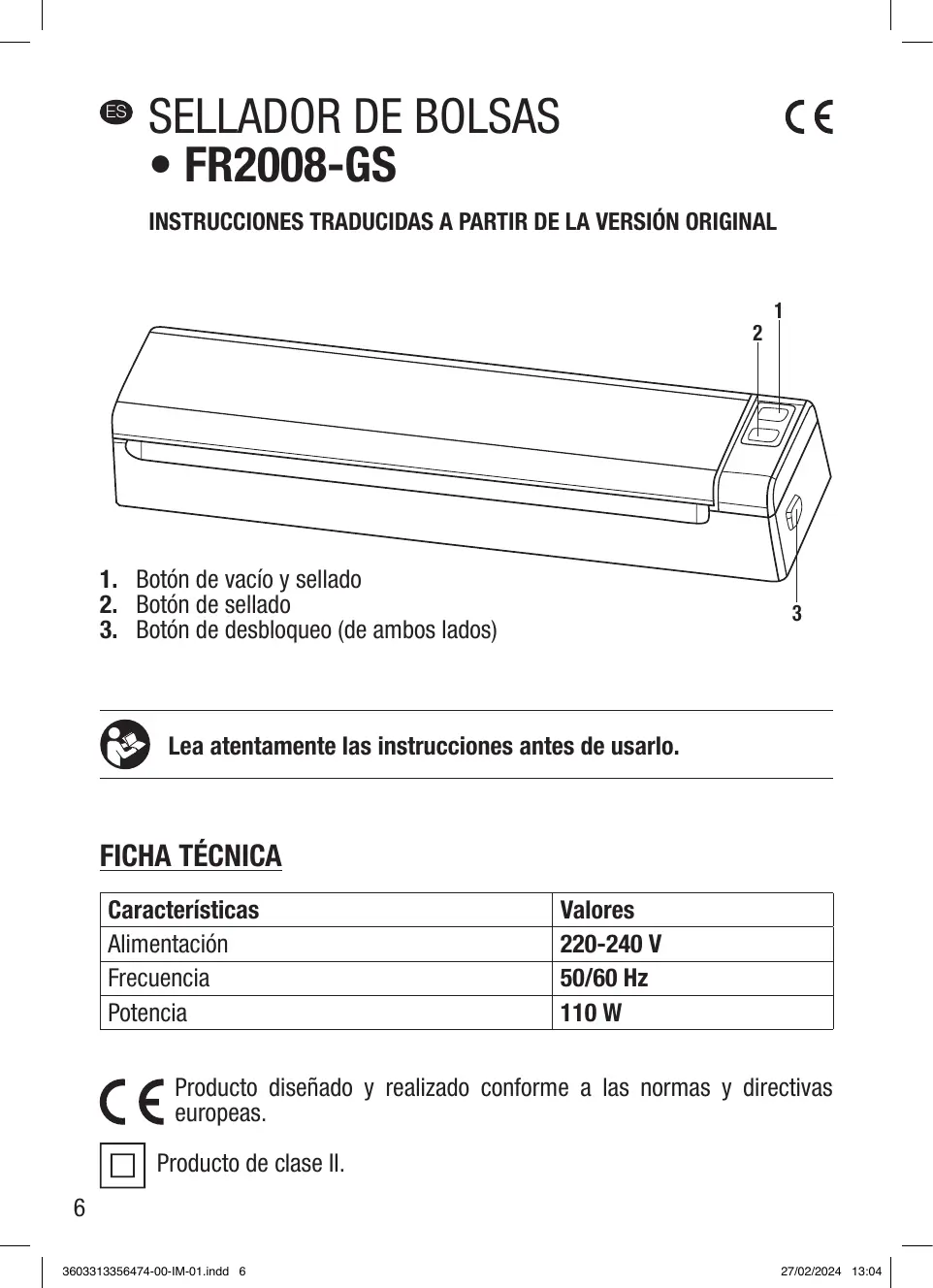 Características Alimentación Frecuencia Potencia Valores 220-240 V 50/60 Hz 110 W Producto diseñado y realizado conforme a las normas y directivas europeas. Producto de clase II. 3603313356474-00-IM-01.indd 6 27/02/2024 13:04