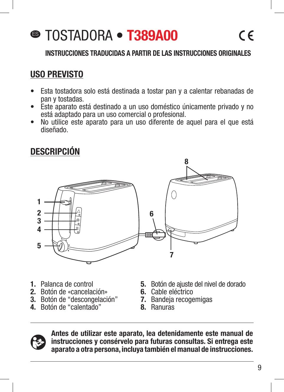 -Esta tostadora solo está destinada a tostar pan y a calendar rebanadas de pan y tostadas.