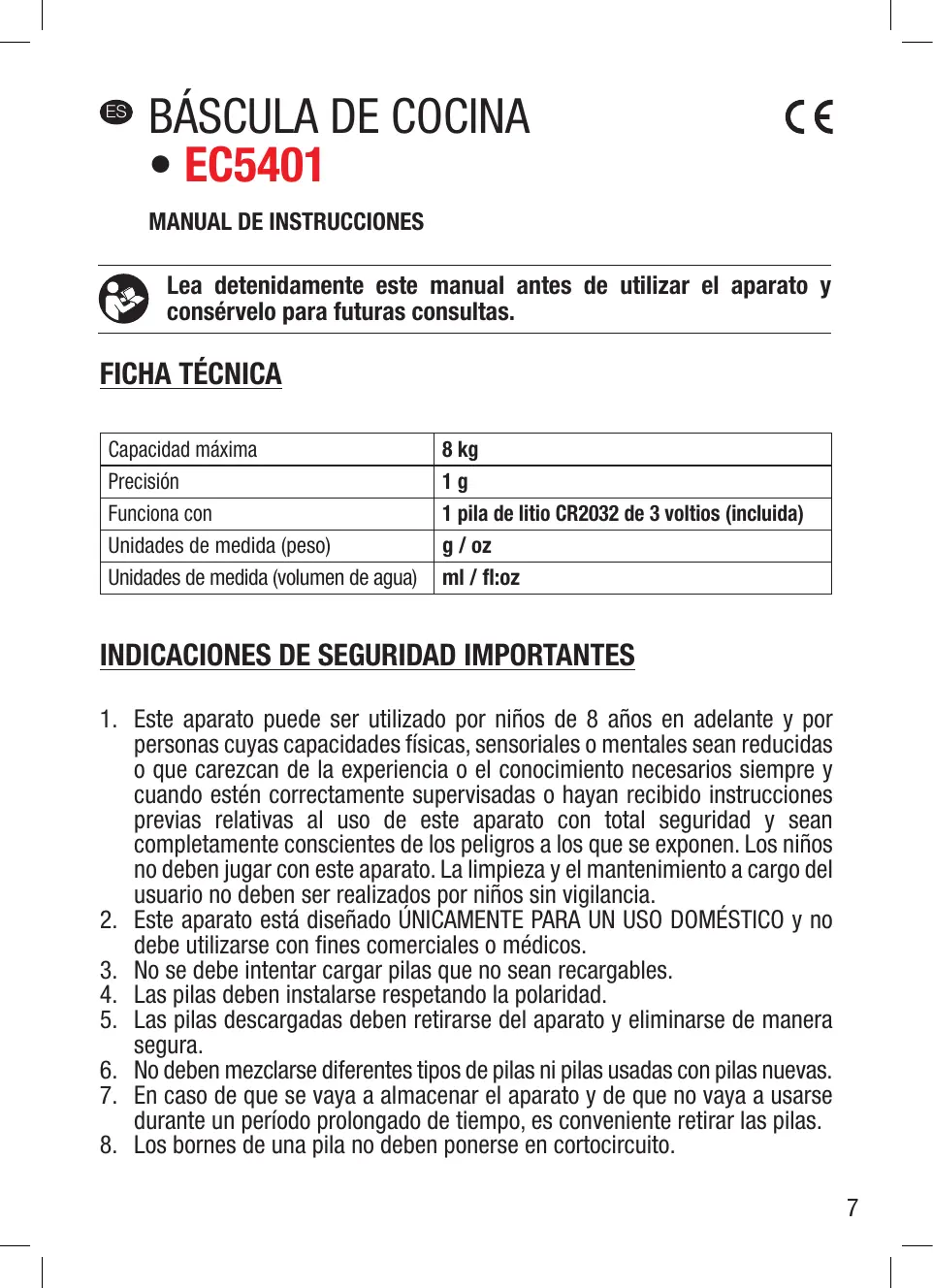el producto y mantenerlo fuera del alcance de los niños. ADVERTENCIA: no exponer las pilas a un calor excesivo como el del sol, el del fuego u otra fuente de origen similar. ADVERTENCIA: no ingerir la pila. Peligro de sufrir una quemadura química. En caso de que se sospeche que las pilas podrían haberse tragado o introducido en cualquier parte del cuerpo, consultar de inmediato a un médico. ANTES DE USAR EL APARATO POR PRIMERA VEZ Antes de utilizar la báscula por primera vez, límpiela tal como se indica en el apartado de LIMPIEZA Y MANTENIMIENTO y retire la banda de protección situada en el compartimento para pilas. USO - Instale la báscula sobre una superficie horizontal, plana y estable. - Pulse el botón “O/I” para encender el aparato. En la pantalla aparecerá el símbolo “0”. - Pulse el botón “UNIT” para seleccionar la unidad de medida que desee: g/ oz; ml/fl:oz. - Coloque los alimentos sobre la superficie o en un bol y la báscula indicará su peso. - Después de realizar el pesaje, pulse el botón “O/I” para apagar el aparato, o éste se apagará automáticamente al cabo de 60 segundos. Introducción/Cambio de la pila - Abra el compartimento situado bajo la báscula. - Introduzca una pila CR2032 de 3 V con la cara hacia arriba. Una vez introducida la pila, el signo “+” debe resultar visible. - Cierre el compartimento.